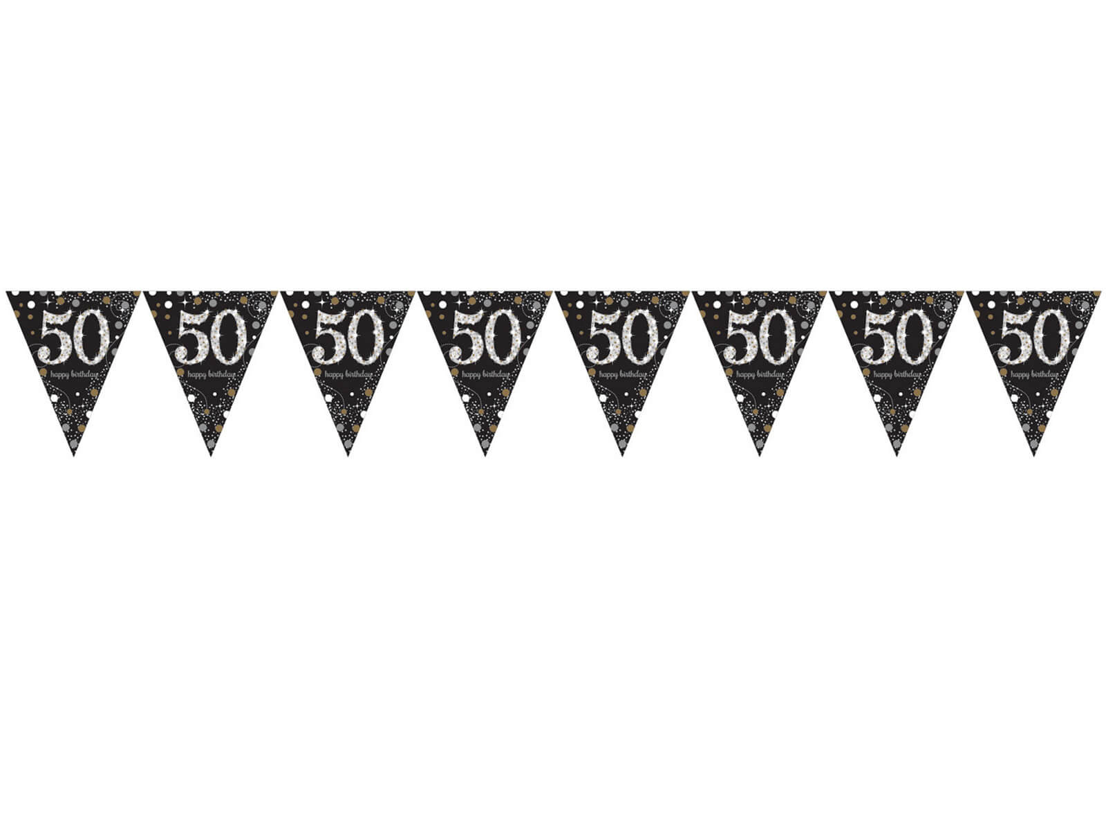• Zászlós banner "50" fekete, ezüst és arany kiegészítőkkel, tökéletes az ötvenedik születésnapi partira. Sikeres 50.