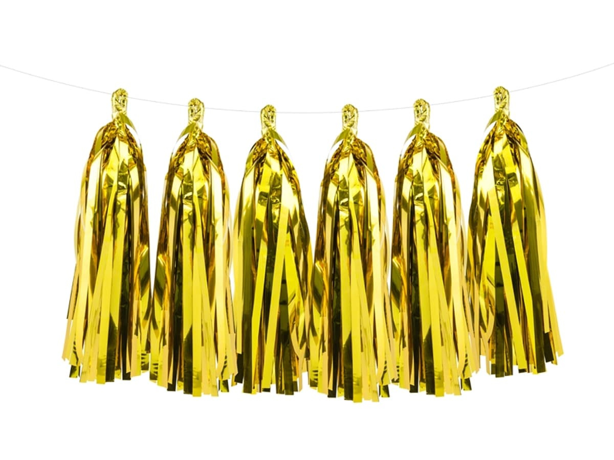A készlet 12 aranyszínű bojtot tartalmaz, amelyek egyenként kb. 150 cm hosszú füzért alkotnak. Arany fényük egyedi bájt kölcsönöz nekik, amely tökéletesen illeszkedik a születésnapi parti hangulatához. A füzérről lógó arany rojtok szemet gyönyörködtetőek lesznek, és varázslatos hangulatot kölcsönöznek a helynek.