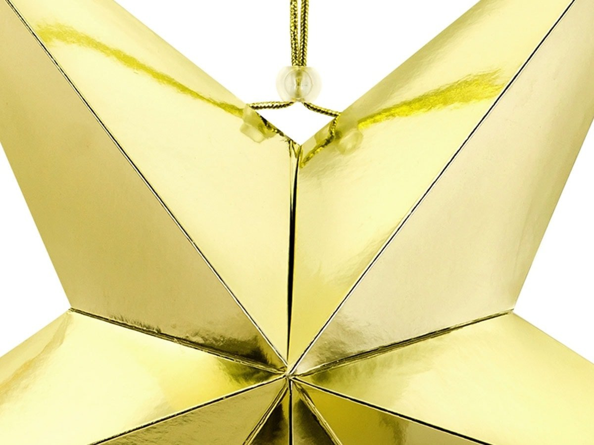 A kb. 70 cm átmérőjű, ötágú papírcsillag egyedülálló dekoráció, amely hatásával és pompájával vonzza a tekintetet. Az arany tükörpapírból készült dekoráció csillogást és eleganciát sugároz, és bájt kölcsönöz bármely belső térnek.