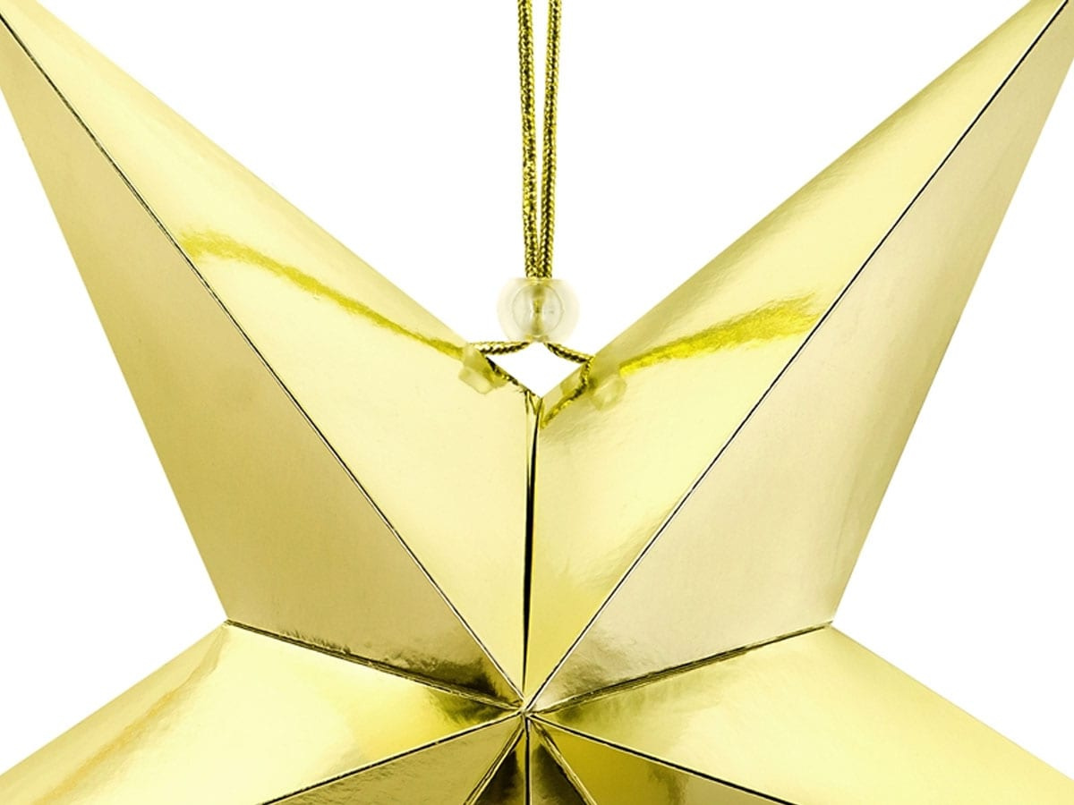 Az ötágú papírcsillag csodálatos dekoráció, amely csillogást és eleganciát kölcsönöz bármely belső térnek. A tükrözött aranypapírból készült dekoráció lenyűgöző hatásával és finom csillogásával. A csillag arany zsinórral rendelkezik, így bárhová kényelmesen felakasztható.