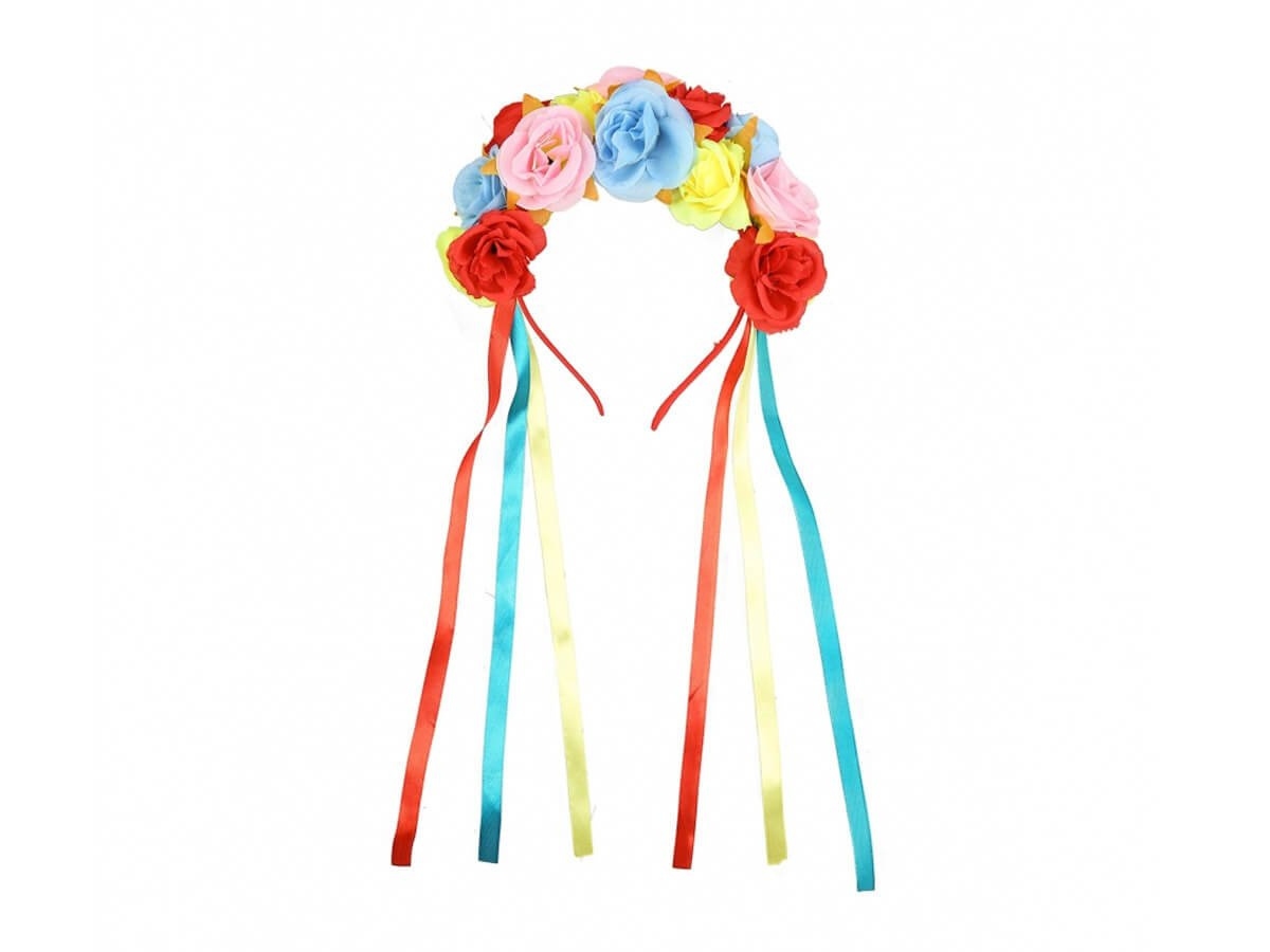 • Mesterséges színes virágokkal díszített fejpánt. Oldalán szalaggal díszített szalag.