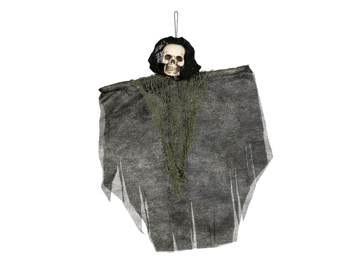 Itt egy fekete sálba öltözött csontvázat ábrázoló függő dekoráció - tökéletes Halloween alkalmából: