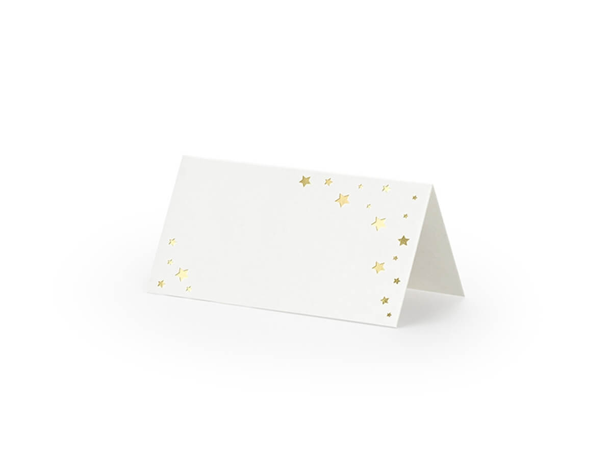 • Papír asztali kártya fehér színben, arany csillagokkal. A tökéletes asztali dekoráció szilveszterre