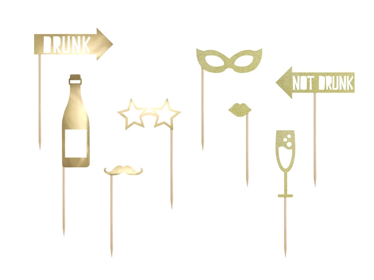 Fedezze fel az örömöt és a szórakozást a Let's Celebrate fotó kellékkészletünkkel. Ezek a papír kellékek egy pálcikán tökéletesek mindenféle alkalomra, a szilvesztertől az újév napjáig és más emlékezetes pillanatokhoz. A csomagban a következőket kapja: pezsgő, pohár, maszk, poharak, száj, bajusz és "Részeg" és "Nem részeg" feliratok".