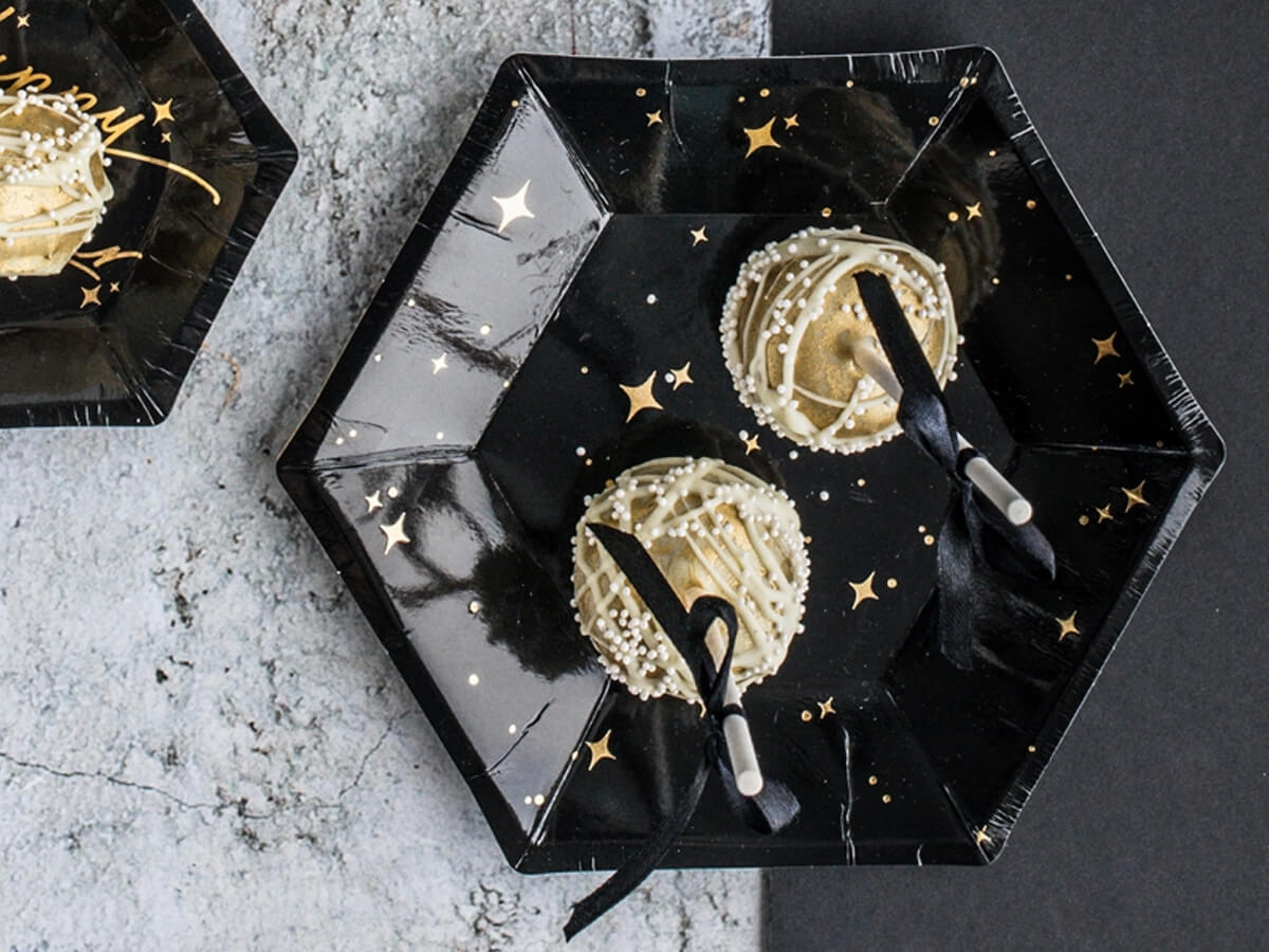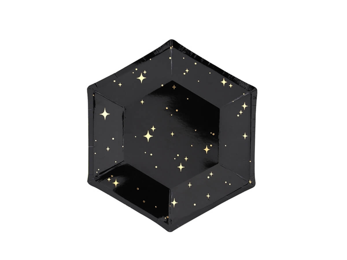 A termék egy 6 darabos, 20 cm átmérőjű, erős papírból készült tányérkészlet. Mélyfekete színük tökéletes kontrasztot alkot az aranyszínű, fényes mintával, így feltűnő hátteret teremtve a rajtuk felszolgált ételeknek. Szilveszterre és újévre készült.