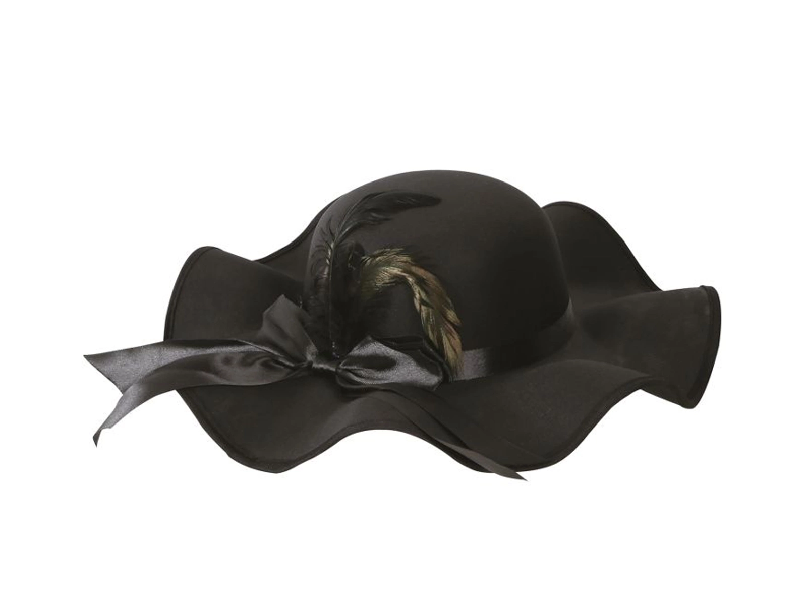 Egy elegáns fekete kalapot hullámos karimával, stílusos masnival és tollal díszítve, amely tökéletesen kiegészíti az 1920-as évek ihlette öltözéket. Ez a kalap nem csak elegánsabbá teszi az öltözékét, hanem részletgazdagságával és kivitelezésével is felhívja magára a figyelmet. A kalap kerülete 38 cm a kényelmes illeszkedés érdekében.