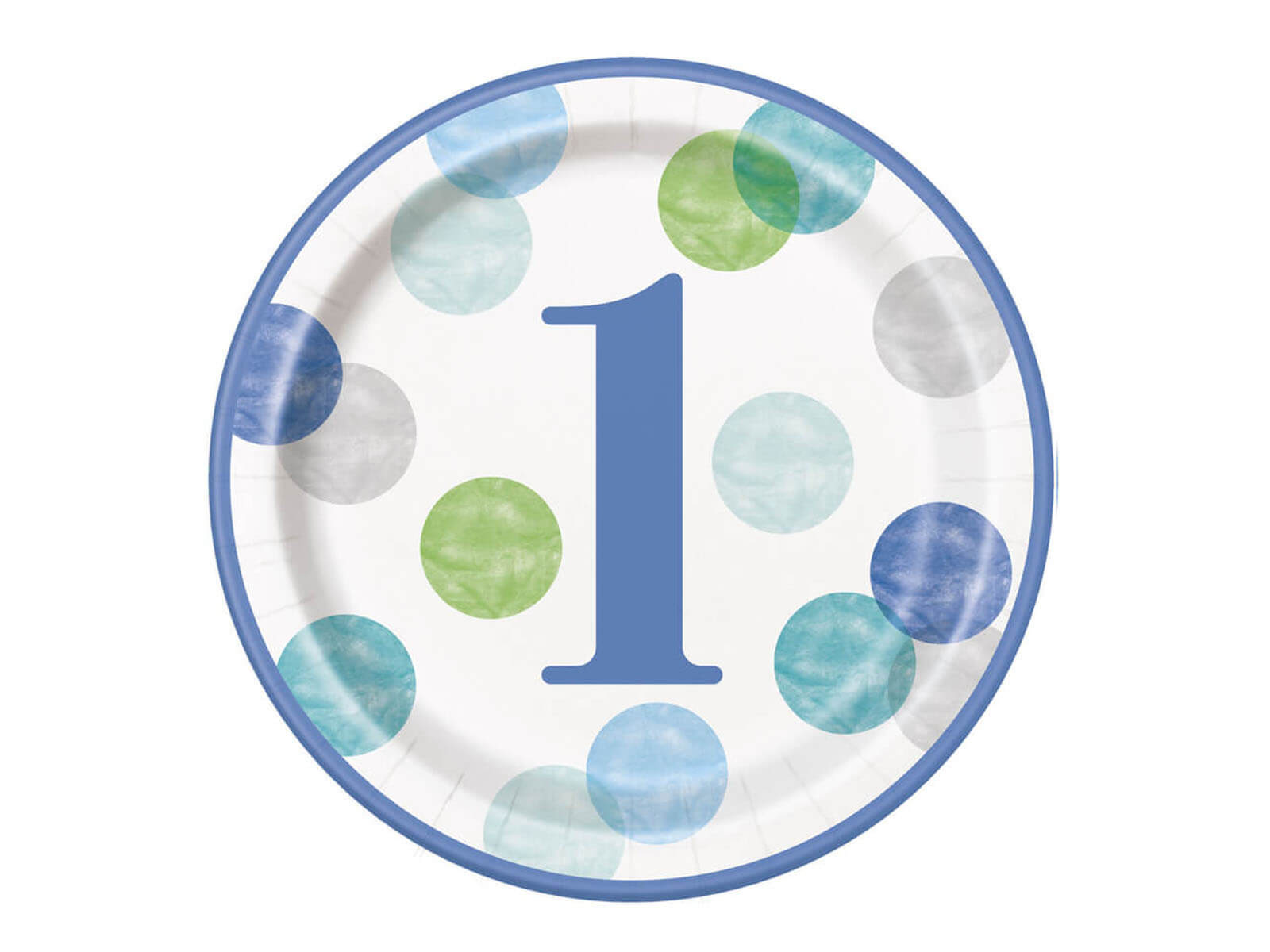 • Papír születésnapi tányérok egy fiú születésnapjára a Dots készletből.