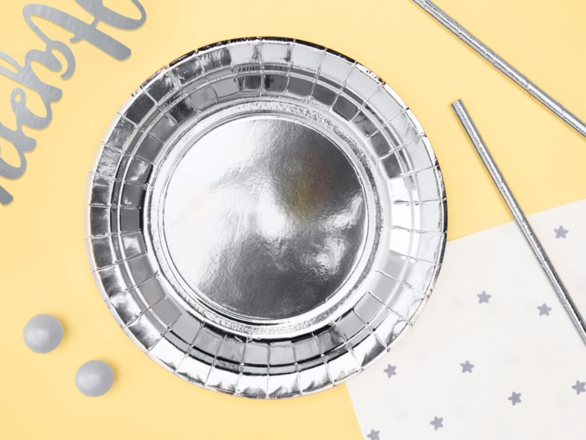 A hat darabos csomagban kínált, 23 cm átmérőjű tányérok tökéletesek rágcsálnivalók, desszertek vagy könnyű ételek tálalására. Ezüst színük eleganciát és csillogást kölcsönöz minden asztalnak, egyedi hangulatot teremtve a partin.