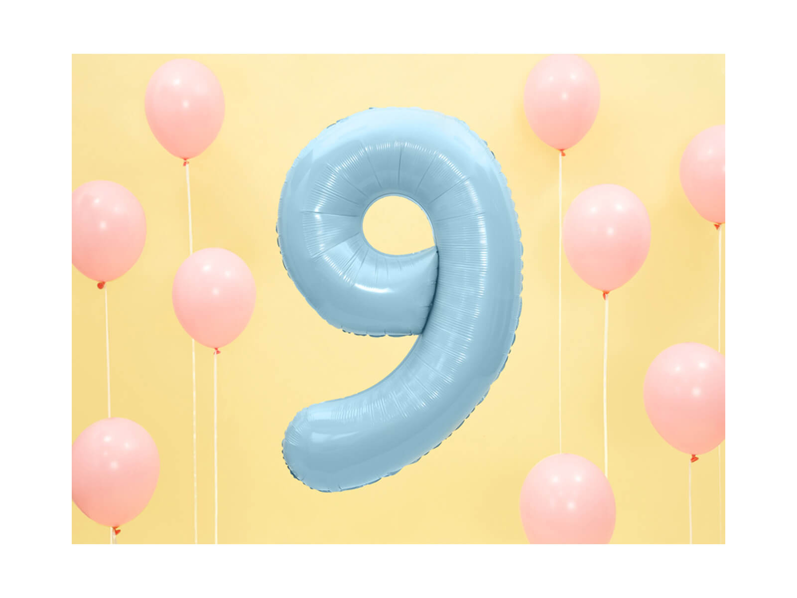 • Fólialufi - kék kilences "9", speciális tartókkal a könnyű összeszereléshez. Ideális dekoráció születésnapokra, kombinálható más lufikkal, hogy egy adott számot alkossanak.