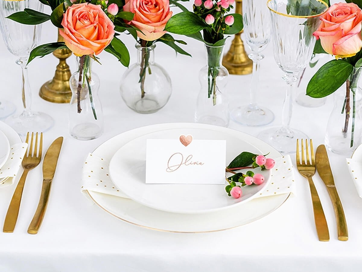 • Fehér papír névjegykártya rózsaarany fémezett szívvel az esküvői asztalra.