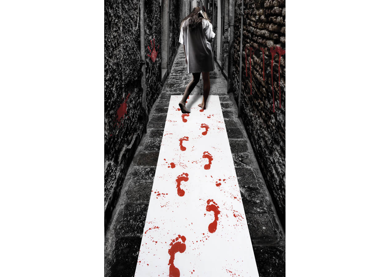 Fehér szőnyeg vérfoltos lábnyomokkal - 450 cm.