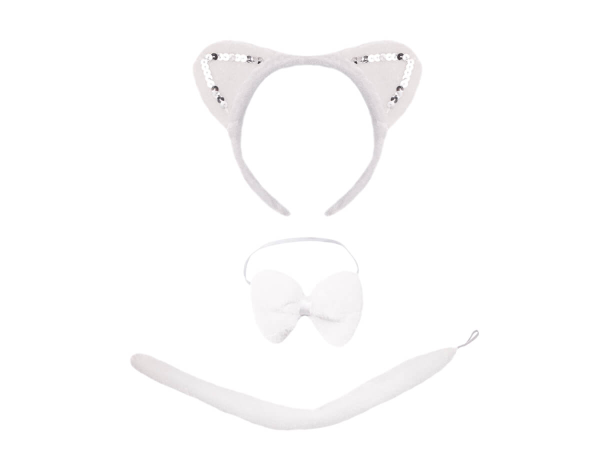 • Fejpánt, csokornyakkendő és cicafarok készlet fehér színben.