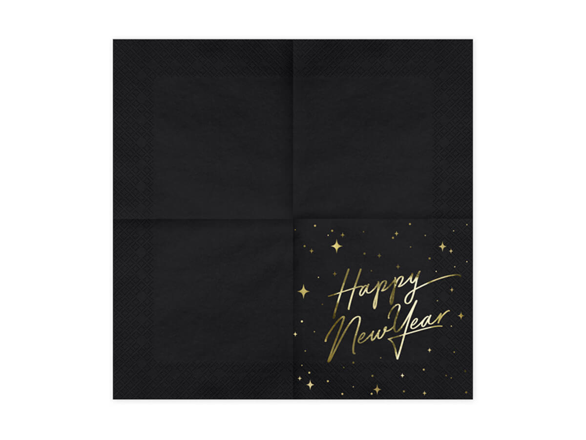 • Papírszalvéták fekete színben, aranyszínű Boldog új évet nyomtatással. Nagyszerű asztali dekoráció szilveszterre és újévre.