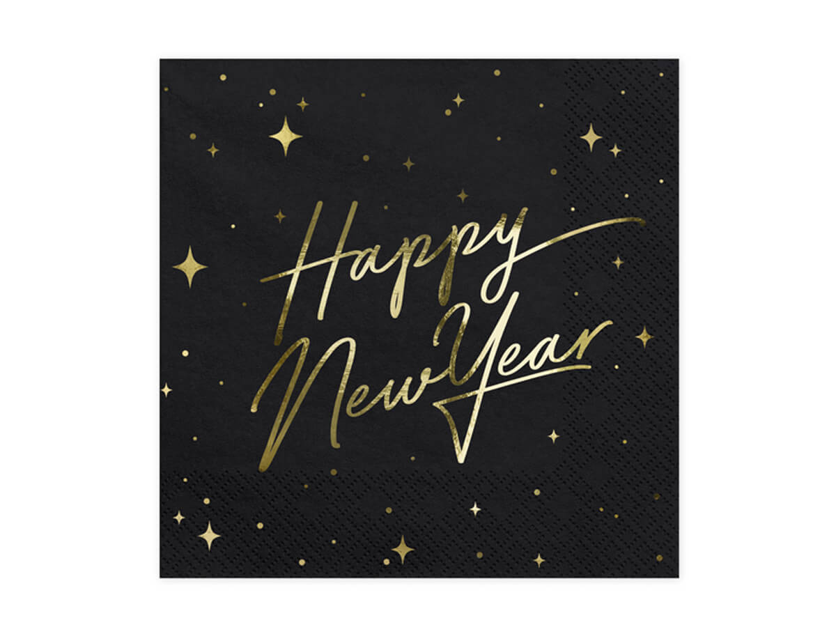 Fedezze fel egyedi 'Boldog új évet' szalvétáinkat fekete színben. Ezek az elegáns, aranynyomással díszített papírszalvéták tökéletes kiegészítői az asztalának szilveszterkor és szilveszterkor.