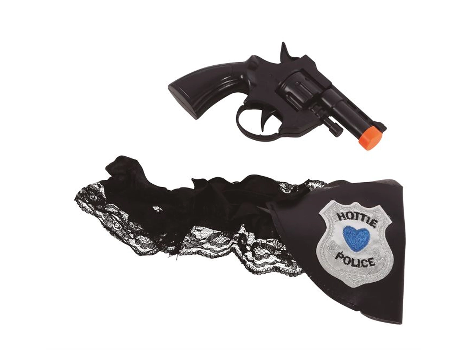 • Csipkés harisnyakötő pisztolytáskával és mini rendőrségi pisztollyal, a tökéletes kiegészítője egy rendőrnő ruházatának.
