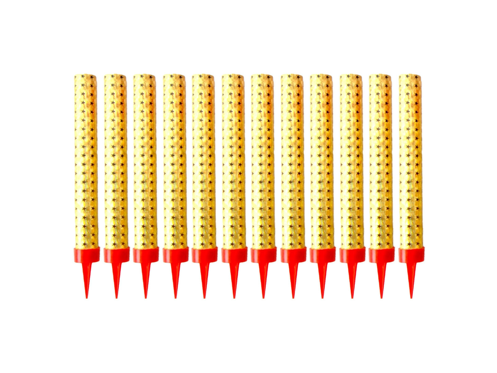 Világítsa meg ünnepségeit exkluzív arany torta szökőkutakkal. Mindegyik 12 cm magas, ideális dekoráció születésnapi tortákhoz, esküvői tortákhoz vagy más különleges alkalmakhoz. Tegyen hihetetlen benyomást vendégeire azzal, hogy csillogást kölcsönöz az eseménynek!