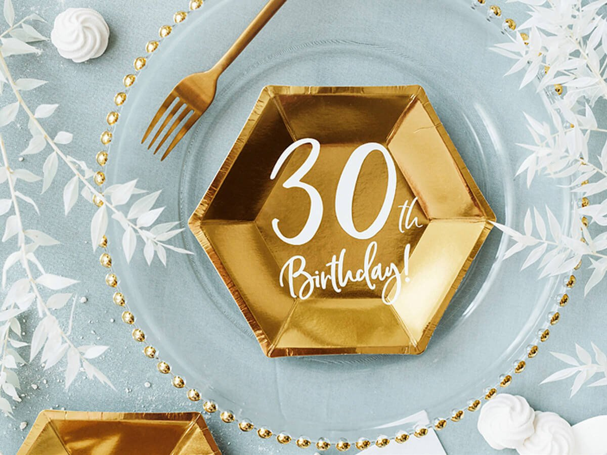 Fedezze fel egyedi 30. születésnapi tányérjainkat arany színben. Ezek az elegáns papírtányérok tökéletes kiegészítői bármely születésnapi partinak, egy kis csillogást és eleganciát kölcsönözve az asztalnak.
