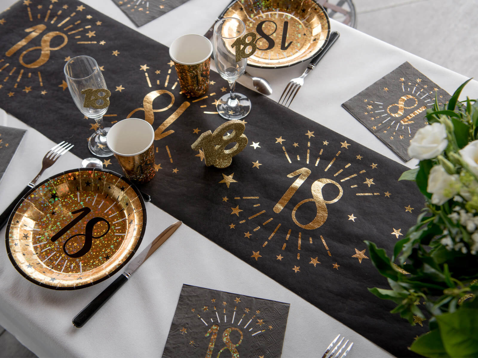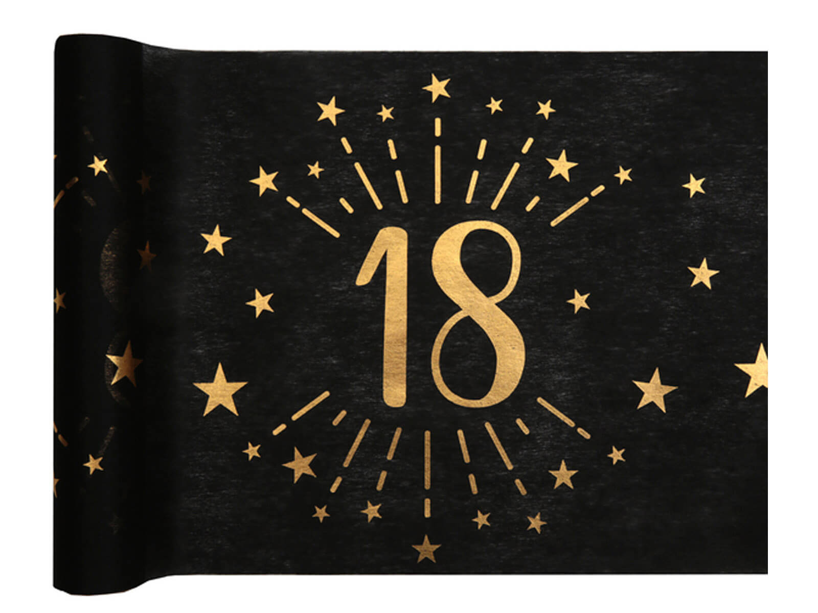 • Asztali futó fekete, arany mintával 18 a Sparkling készletből. Tökéletes egy 18. születésnapi partira, poliészterből készült.