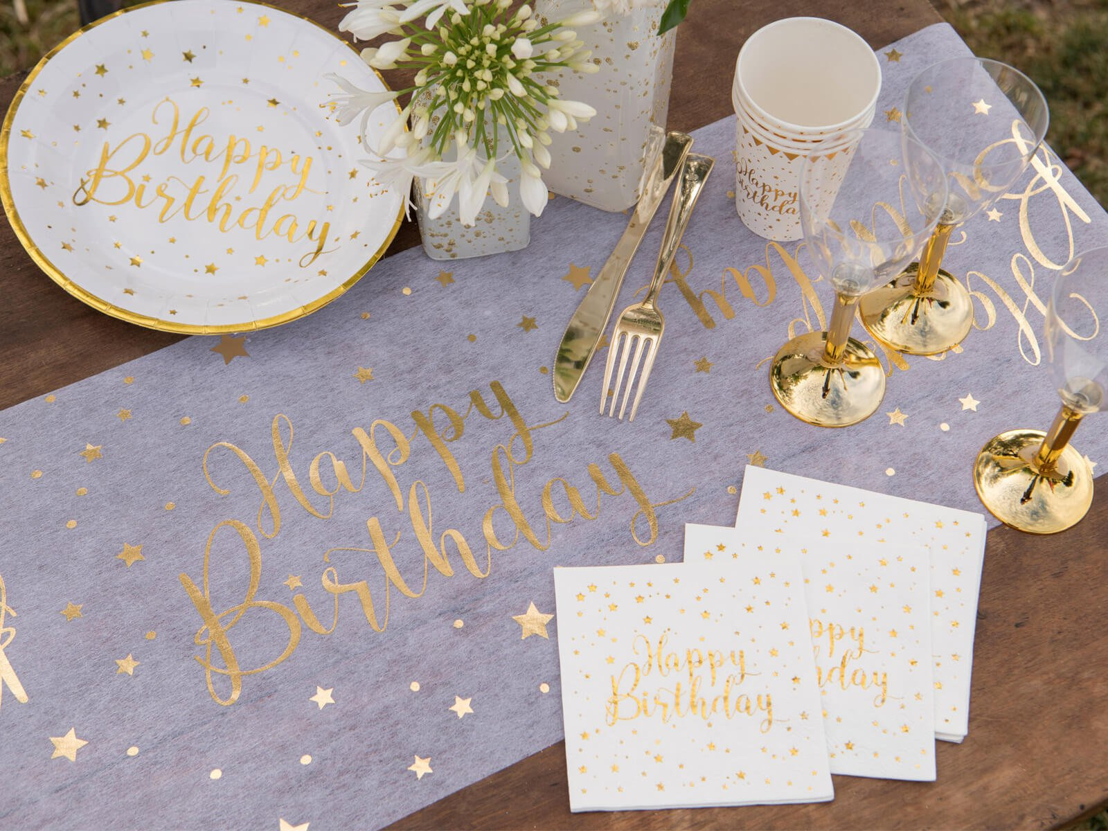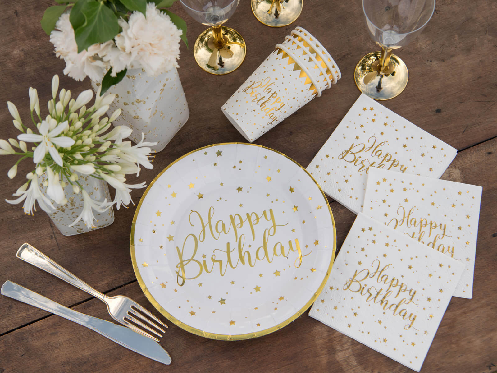 A Happy Birthday szalvéták kiemelkednek a piacon kapható többi termék közül. Fehér színűek, fémezett arany "Boldog születésnapot" felirattal, ami növeli eleganciájukat és kifinomultságukat. Kihajtott állapotban 25 cm-es, ami praktikussá és funkcionálissá teszi őket. Minden csomag 20 darabot tartalmaz, így nagyszámú vendéget lehet kiszolgálni.