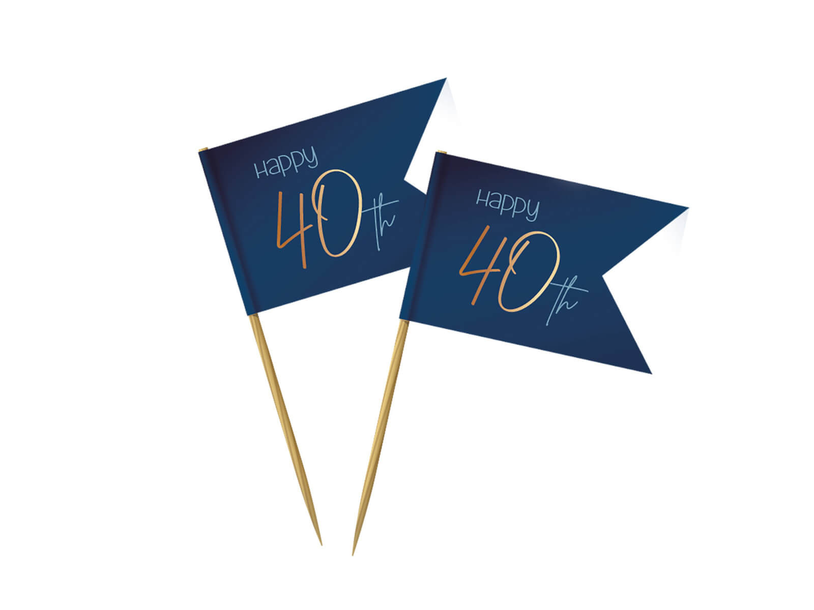 • Dekorációk tollas zászlókon az Elegant True Blue sorozatból, tengerészkék színben, Happy 40th felirattal, díszítés egy torta vagy muffinok számára egy negyvenedik születésnapi partihoz.