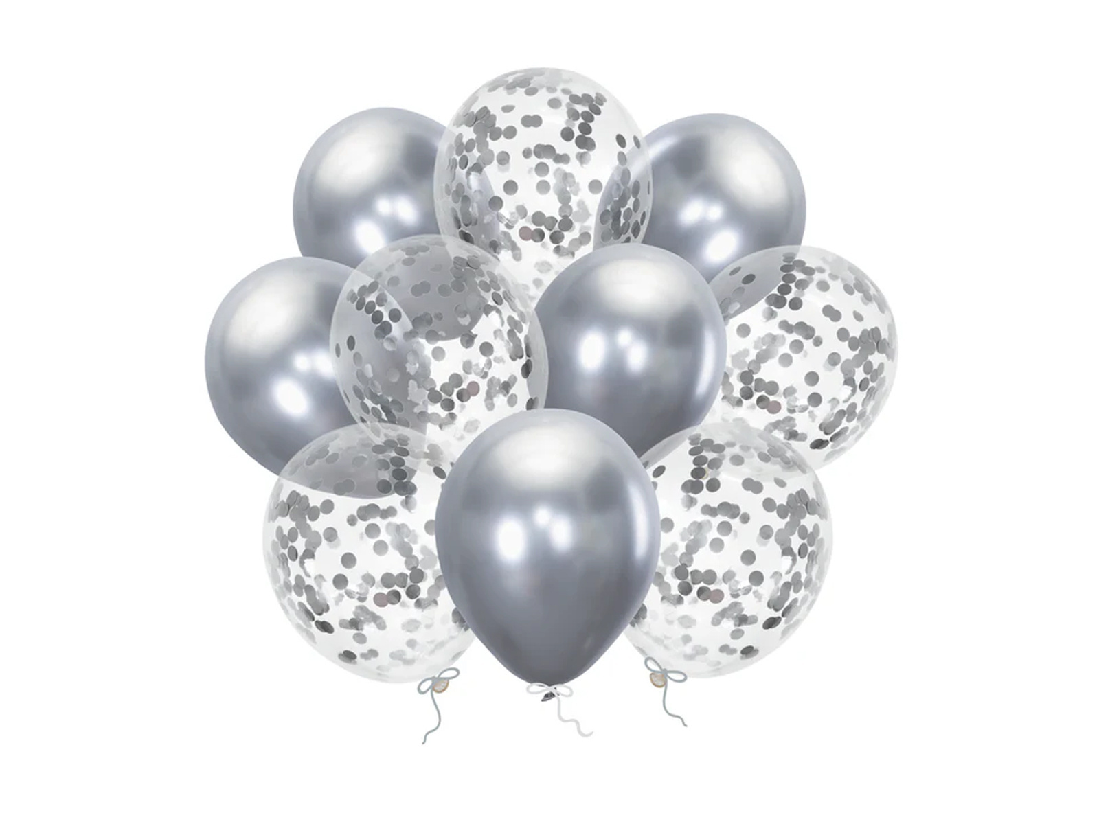 Fedezze fel ezüst króm lufi készletünket - a tökéletes kiegészítő minden alkalomra! Ez az egyedi készlet 10 db 30 cm átmérőjű lufiból áll, köztük 5 ezüst konfetti lufi és 5 ezüst króm lufi.