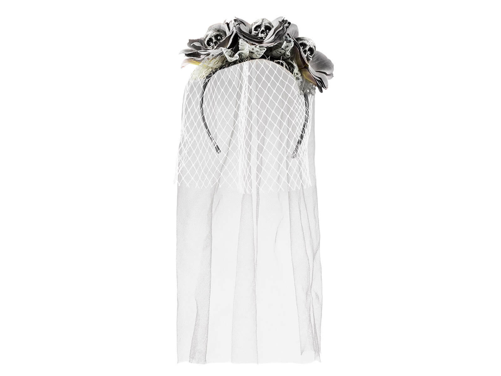 • Fejpánt fehér fátyollal és szürke virágokkal díszített koponyákkal díszített fátyollal, tökéletes halloweenre.
