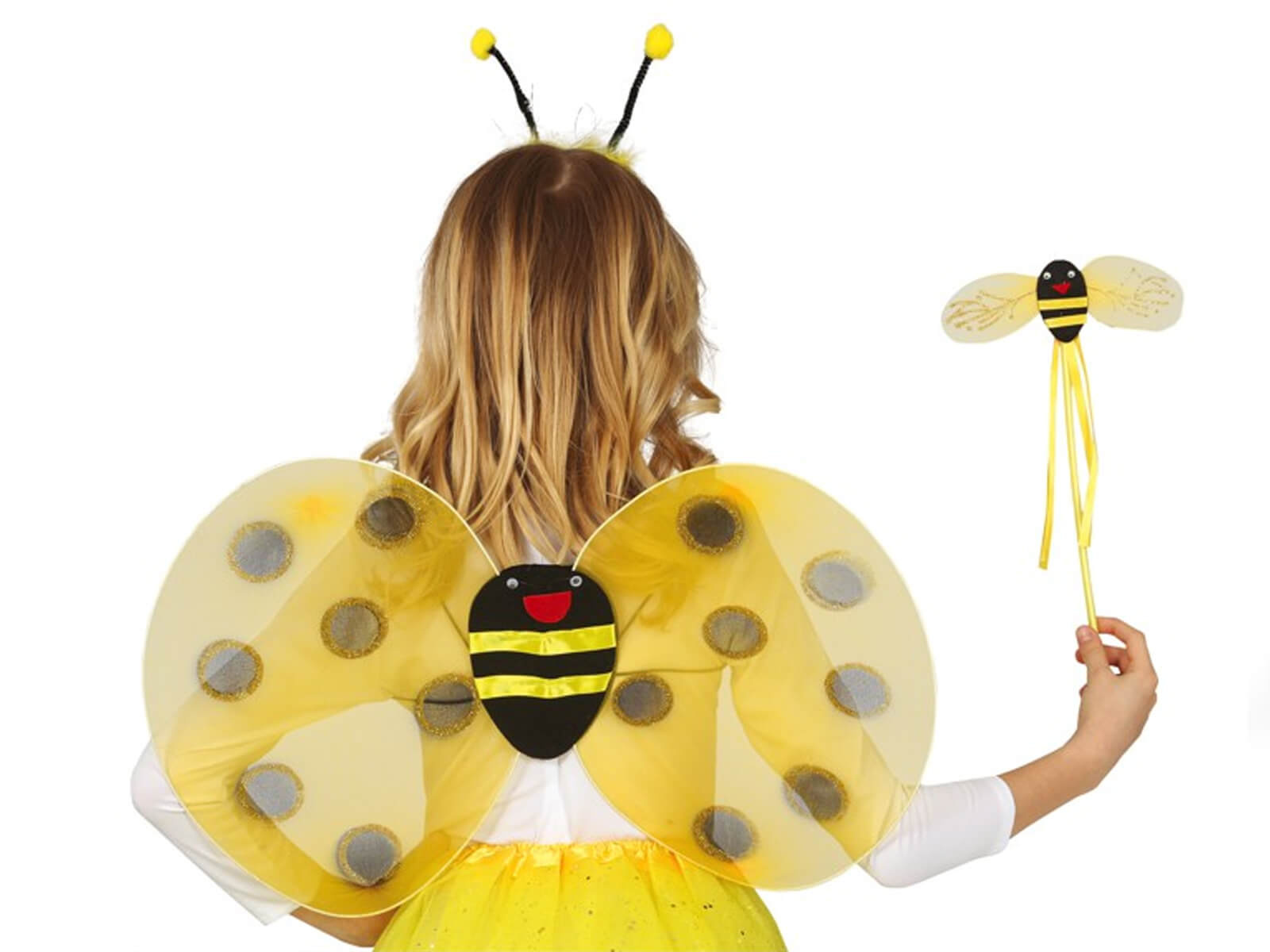 A készlet finom szárnyakat tartalmaz, amelyek mérete 54 cm x 34 cm, amitől gyermeke igazi méhecskének fogja érezni magát. A szárnyakon kívül a készlet tartalmaz egy antennákkal ellátott fejpántot is, hogy bármilyen ruhát feldobjon, és egy varázspálcát, hogy játék közben "varázsolhasson".