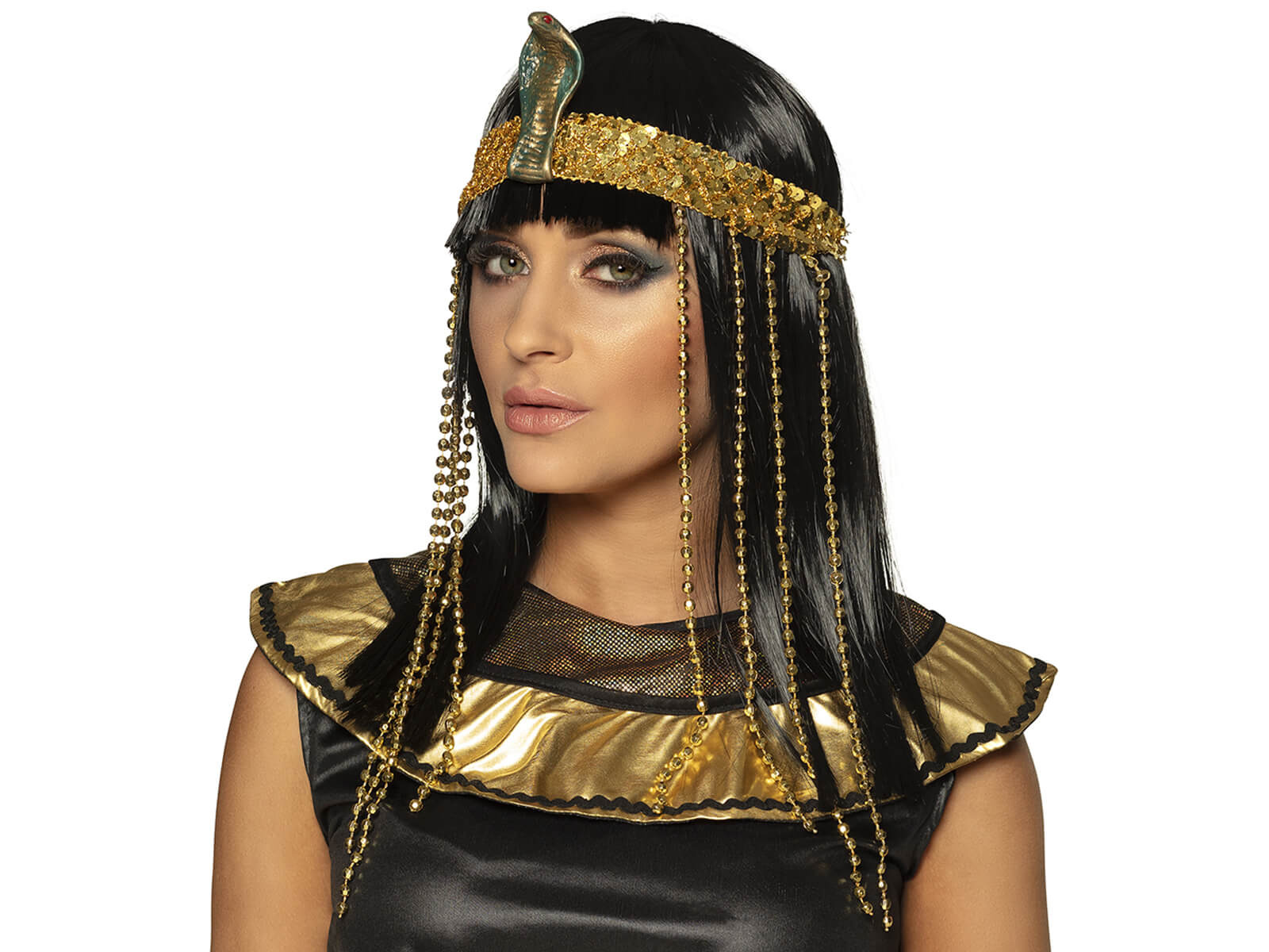 Mutassa meg belső egyiptomi királynőjét az egyedi egyiptomi királynő parókánkkal és fejpántjával! Ez az egyedülálló Kleopátra paróka fekete színben, arany csillogó szalaggal és kígyó motívummal tökéletes kiegészítője bármely egyiptomi öltözéknek.