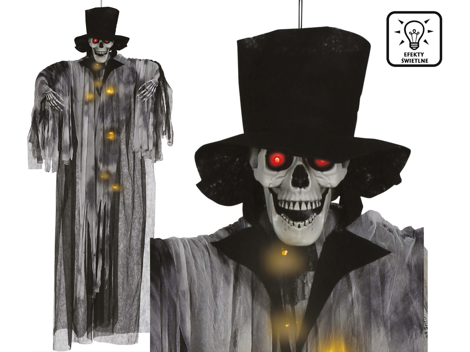 Alakítsd át a partidat igazi halloweeni jelenetté a "csontváz vőlegény" függő dekorációnkkal. A részletekre való odafigyeléssel készült, teljes egészében kalap és fekete köpeny, hihetetlen karaktert kölcsönöz minden térnek. Ezenkívül a fényhatások biztosan megragadják a vendégek tekintetét, egyedi, titokzatos hangulatot teremtve. Ideális a bálteremben, az otthonod bejáratánál vagy bárhol máshol, ahol halloweeni dekorációt szeretnél felakasztani.