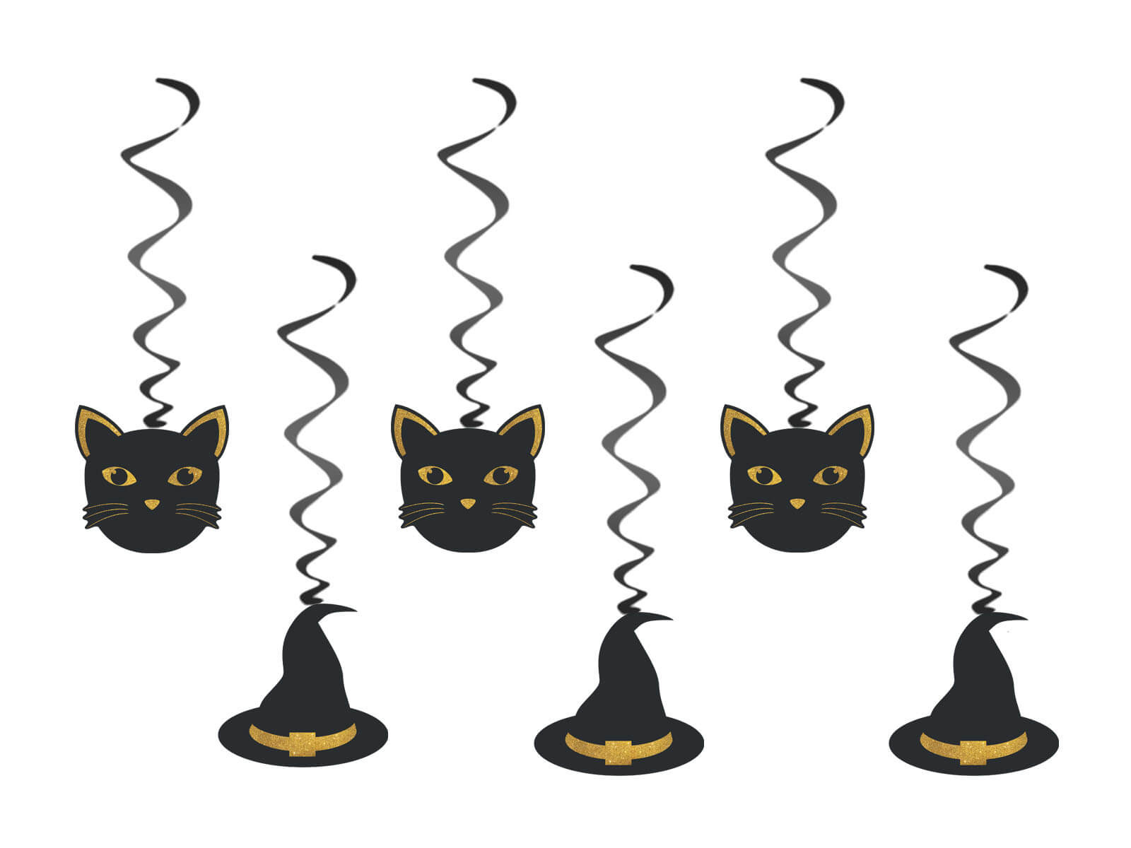 A készlet 6 darab függőt tartalmaz dekorációval, amelyek könnyen felakaszthatók mennyezetre, ajtóra, ablakra vagy falra. A macskás dekoráció 10 cm magas, a boszorkánysapka pedig 11 cm magas. A medál hossza körülbelül 65 cm, így a dekoráció szabadon elhelyezhető a szobában.