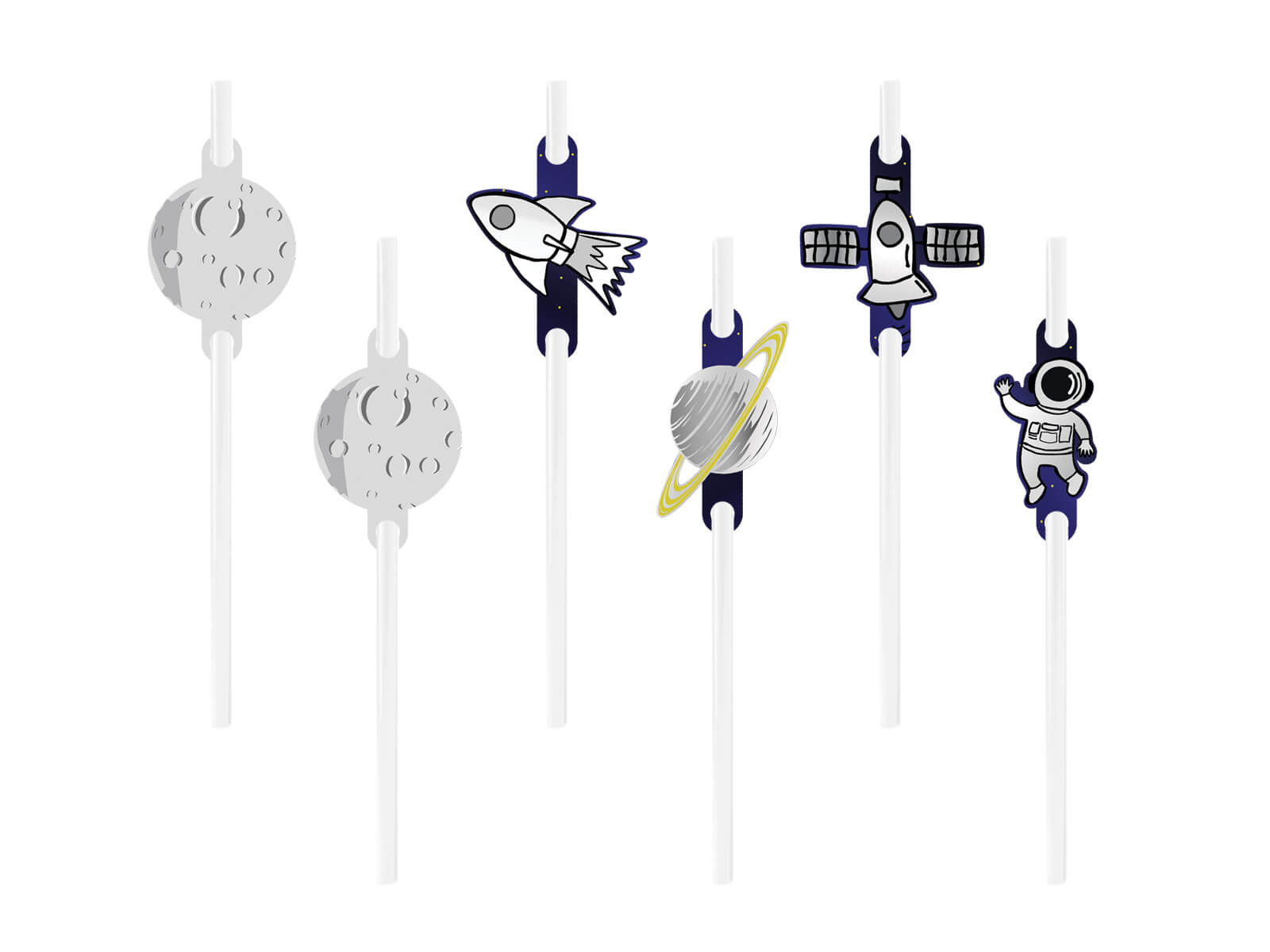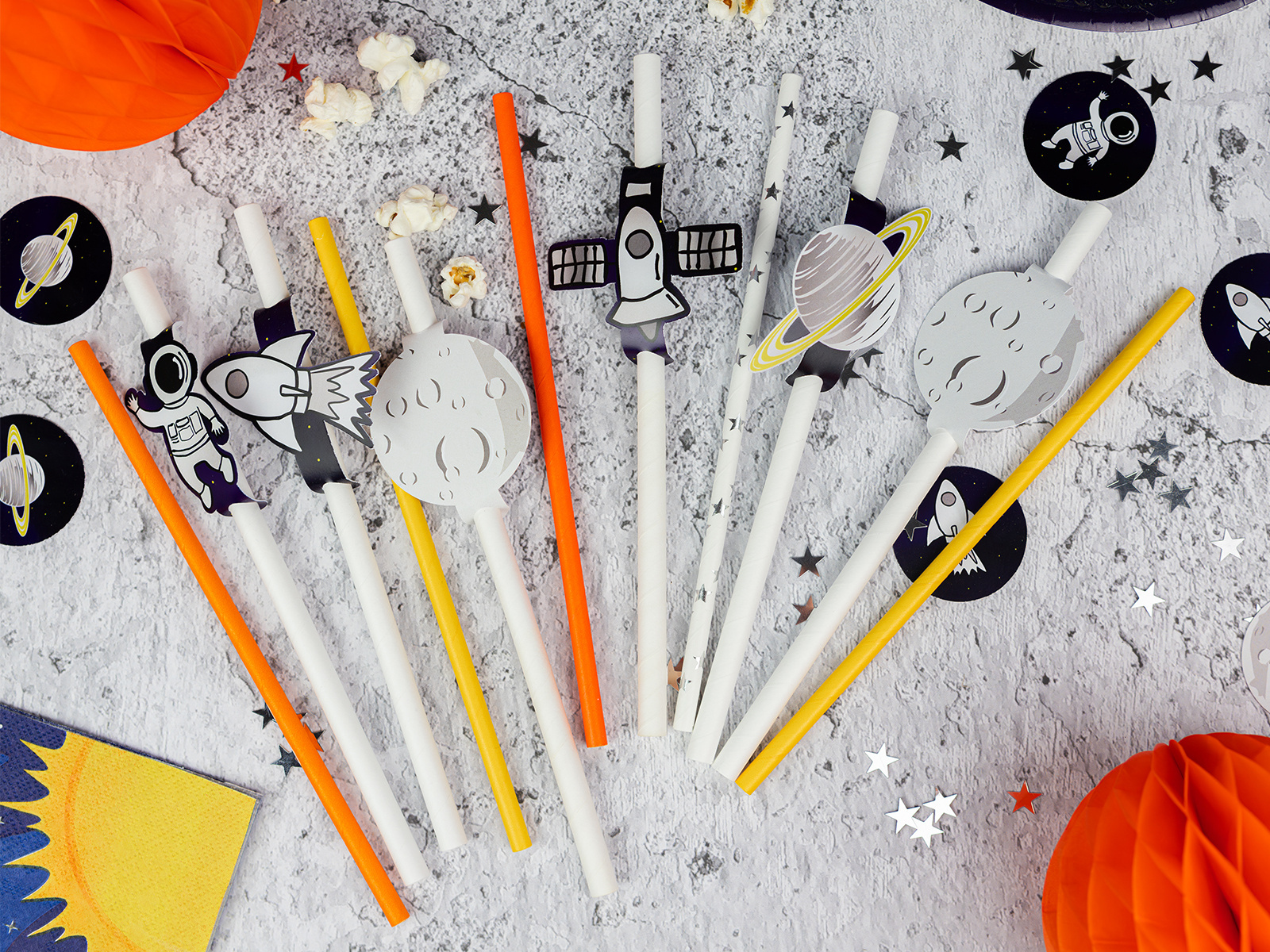 Minden egyes szalmaszálat egy eredeti, 4 cm átmérőjű, kozmikus motívumokat ábrázoló medalion díszít. Ez teszi őket az asztali dekoráció tökéletes kiegészítőjévé egy űr témájú partin.
