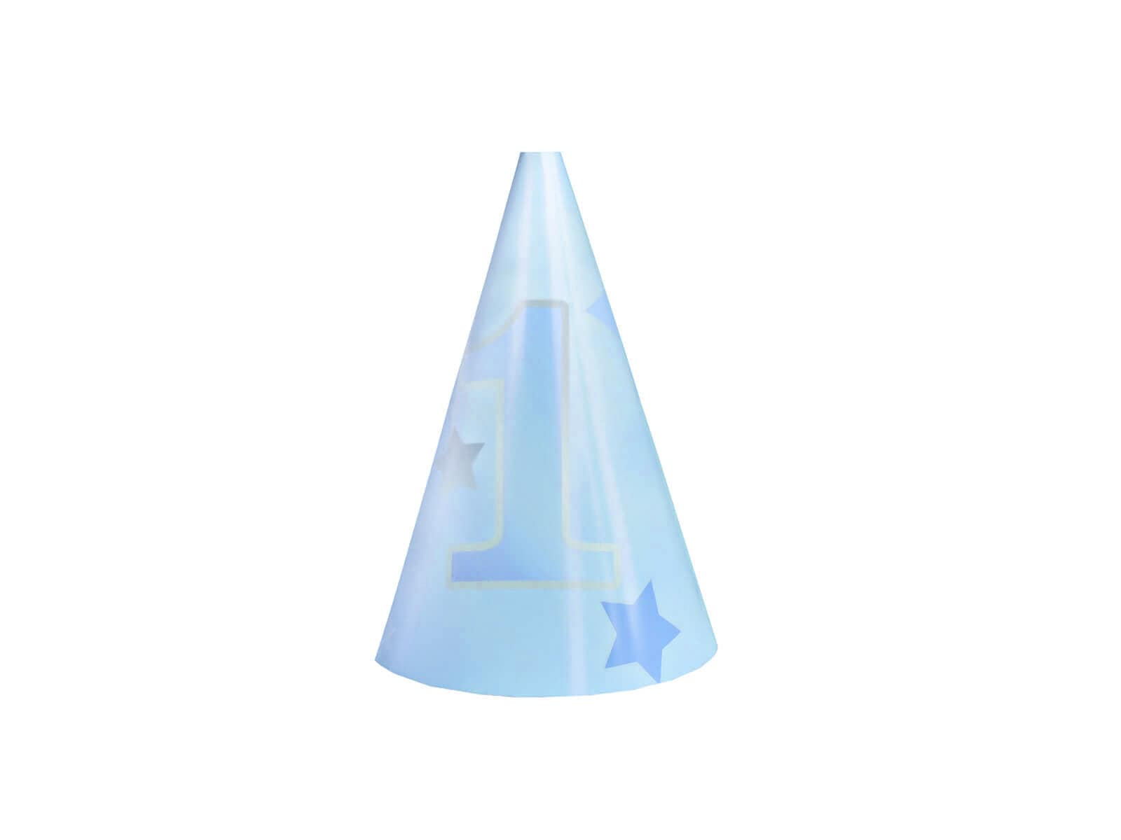 1. Kék papírsapkák az 1-es számmal a születésnapra - tökéletesen illeszkednek a gyermeke első születésnapjának témájához, bájt és örömet adva ennek a különleges alkalomnak.