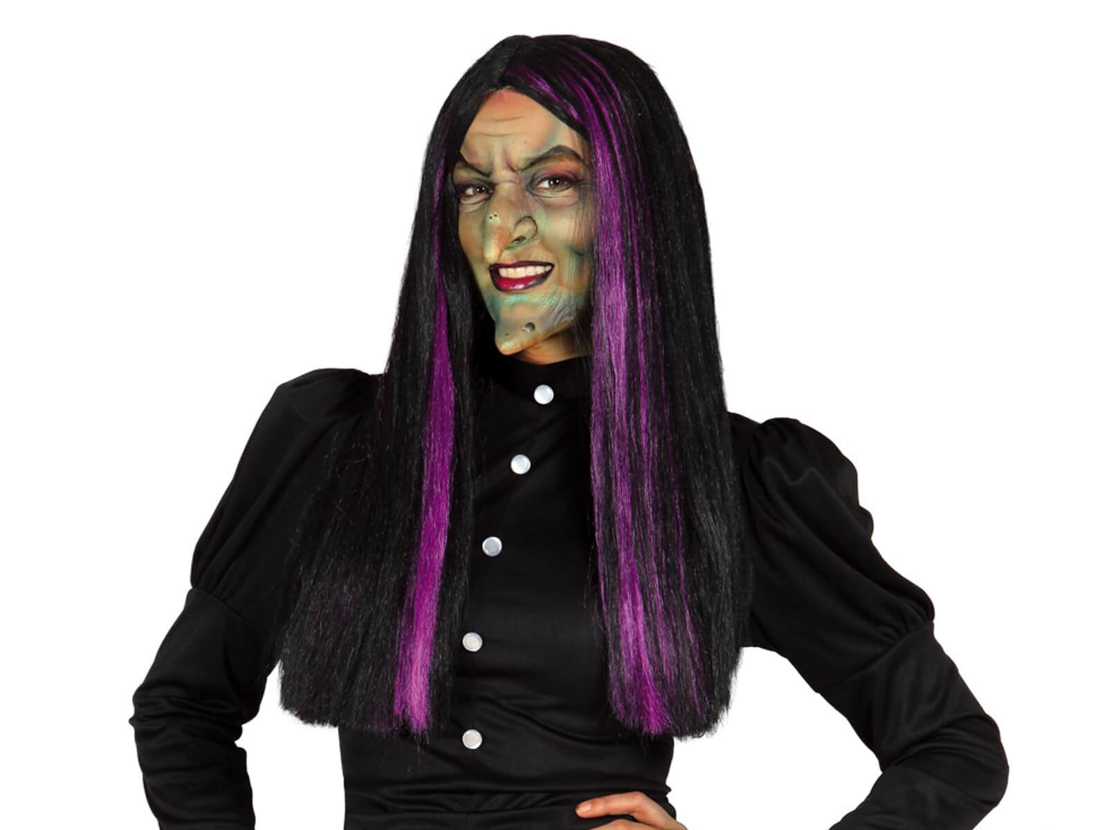 • Boszorkány paróka fekete színben, lila kiemelésekkel. Halloween jelmez kiegészítő.
