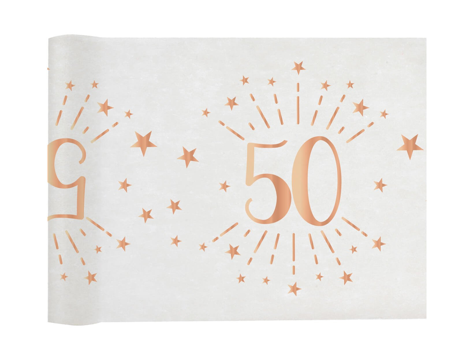 Nyomtatott asztali futó dekoráció 50. születésnapra Szikrázó rózsaszín arany - 30 cm x 5 m - 1 db.