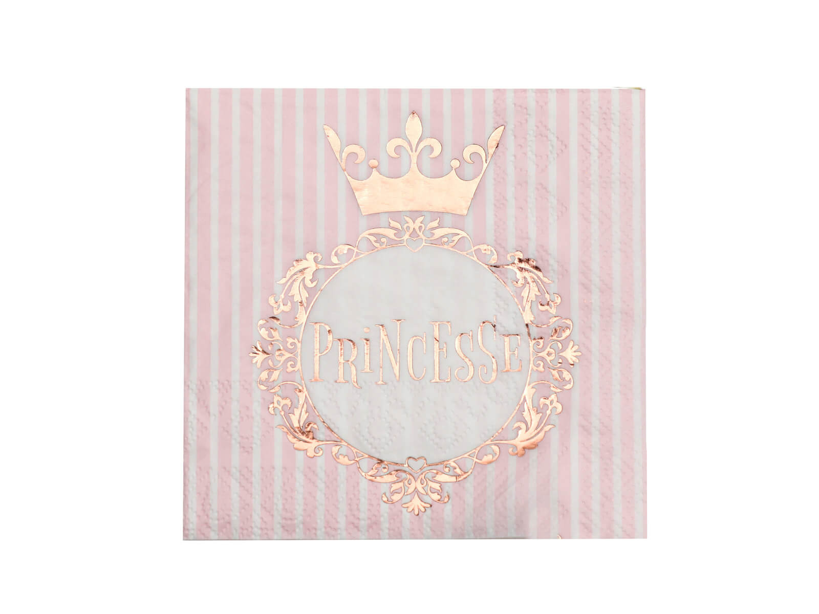 • Rózsaszín szalvéták fehér csíkokkal, rózsaarany metál "Princesse" és dísz és korona. Tökéletes egy kis hercegnő születésnapi partijára.