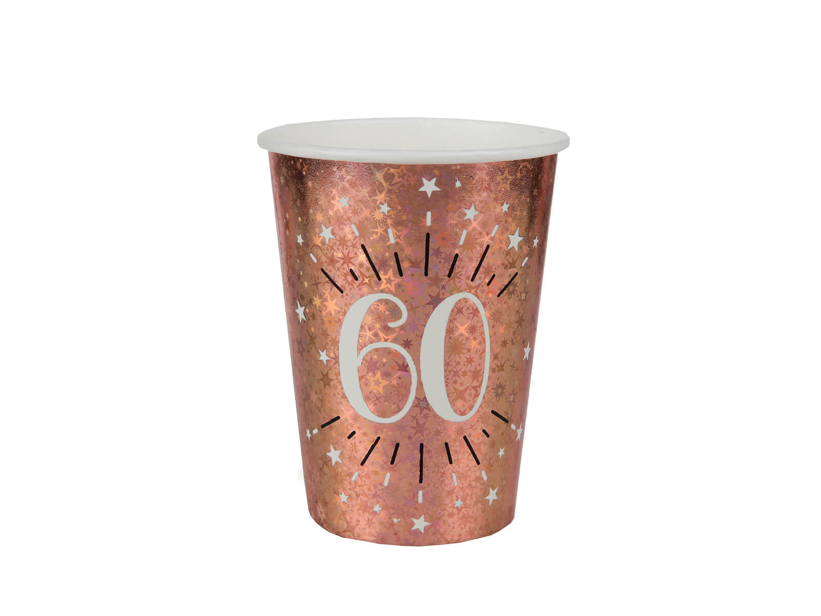 • Rózsaarany papírpoharak a 60-as számmal nyomtatva - hatvan a Sparkling készletből. Tökéletes egy hatvanadik születésnapi partira.