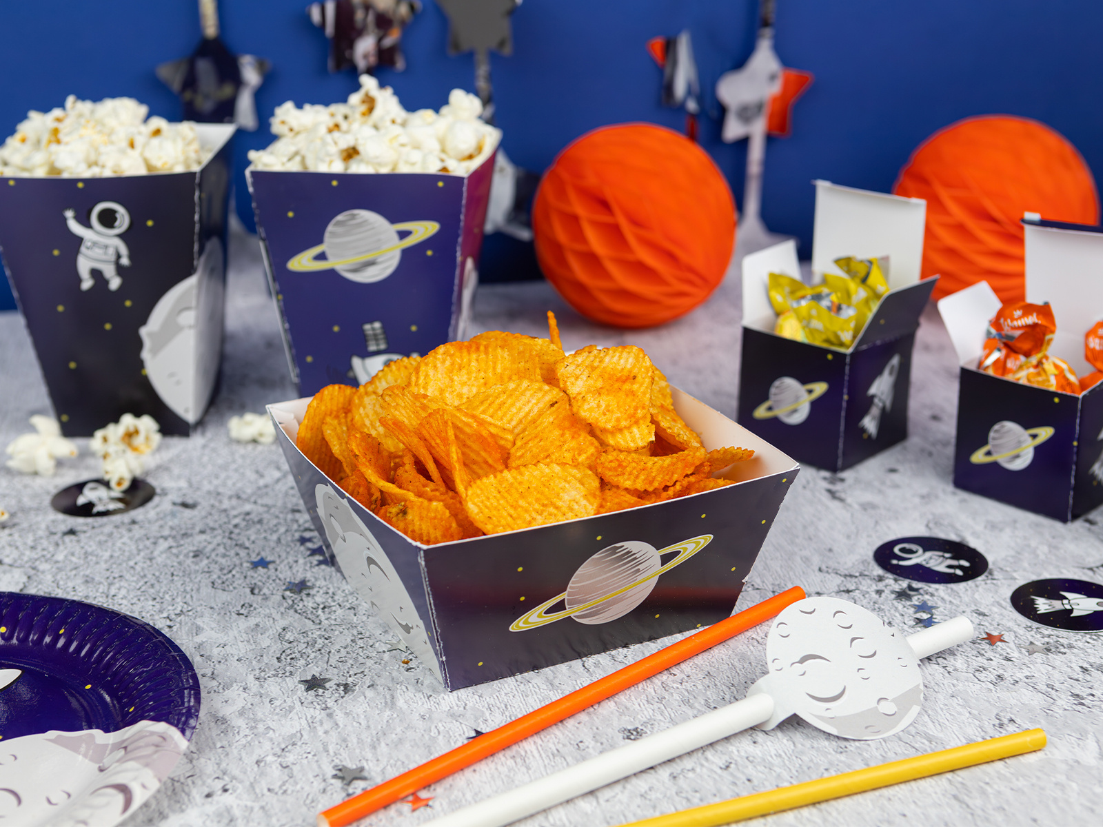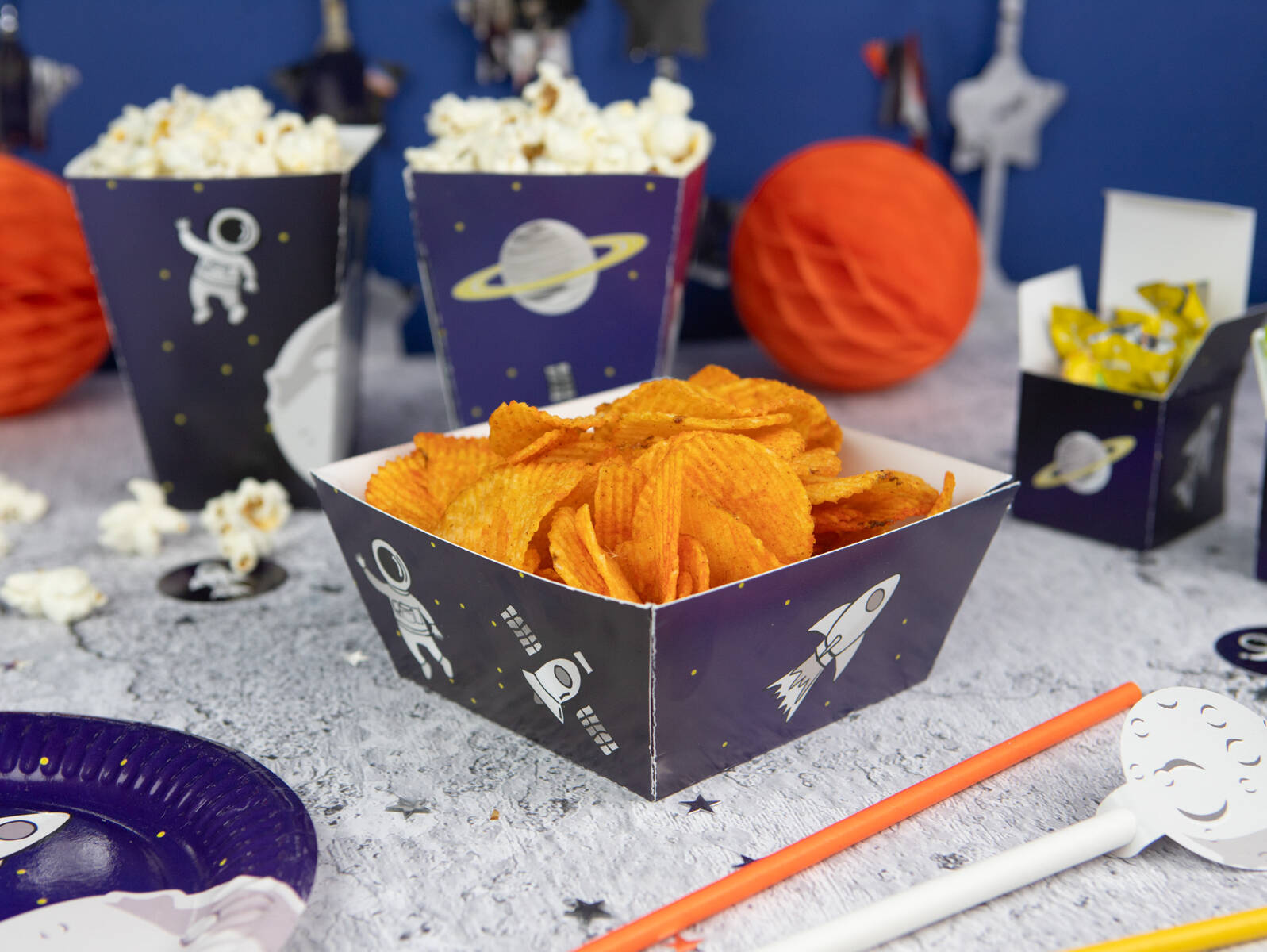 Bemutatjuk saját Cosmos chipsdobozainkat az egyedi és emlékezetes étkezési élményért! Imádnivaló kis papírdobozaink témája a Cosmos születésnapi készlet, így vendégei örömmel fogják élvezni az aranyos formatervezésüket. Ezek a dobozok csomagonként 4 darabot tartalmaznak, és ideálisak mindenféle chips, popcorn és más új édesség tárolására. Mindegyik doboz mérete 10cm x 10cm alap és 6cm magas, felső széle 13x13cm, így rengeteg tárolóhelyet biztosít!