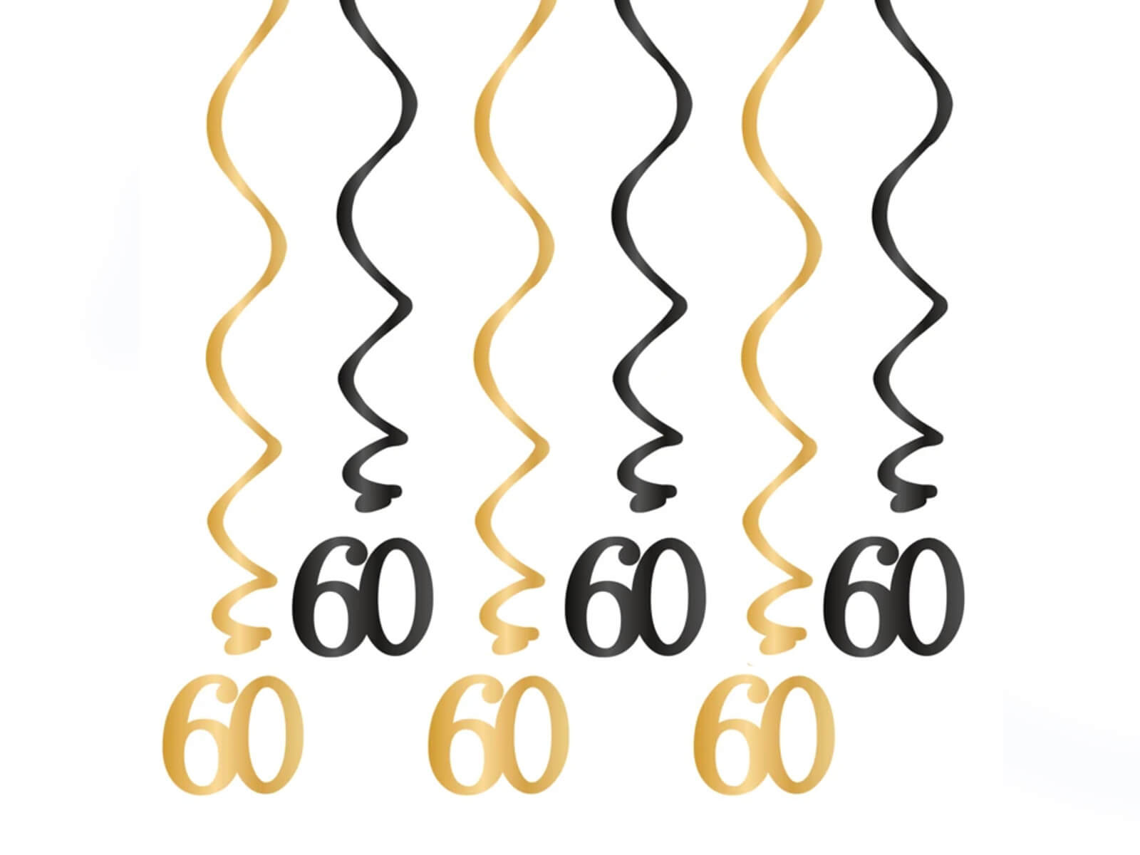 Függő dekorációs örvények 60. születésnapra arany és fekete - 6 db.