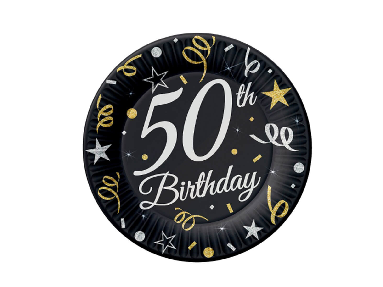 • Születésnapi papírtányérok fekete színben, konfettivel és az 50. születésnap felirattal, tökéletes egy ötvenedik születésnapi partihoz.