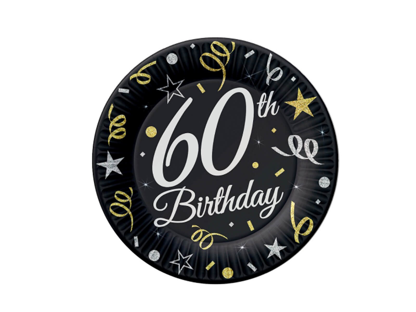• Papír születésnapi tányérok fekete színben, konfetti nyomtatással és a 60. születésnap felirattal, tökéletes a 60. születésnapi partihoz.