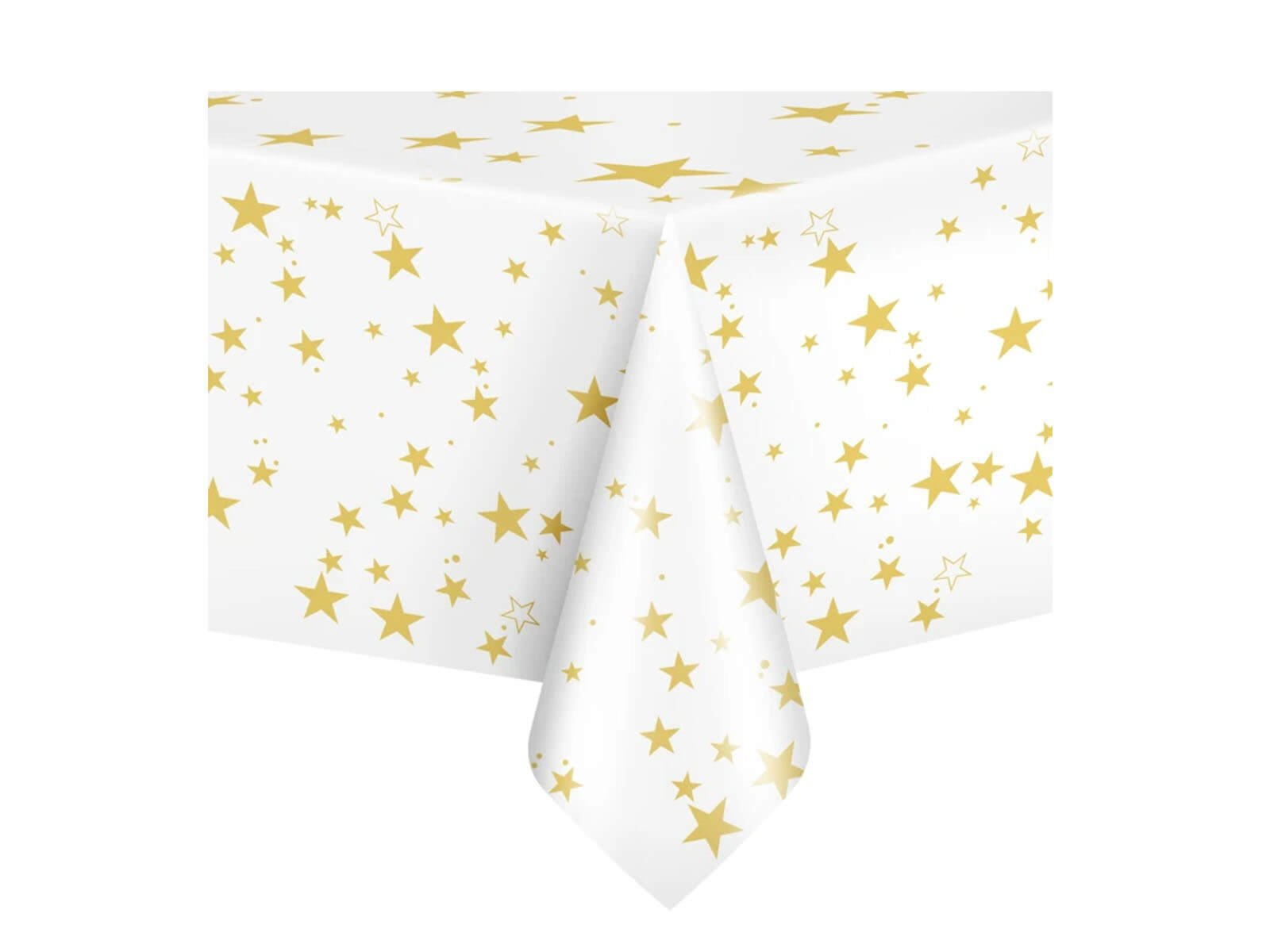Csillogtassa meg terét ezzel az aranycsillagos terítővel. Tökéletes bármilyen különleges alkalomra, bárhol is dönt úgy, hogy megtartja a nagy ünnepséget! Ez az egyedülálló terítő 137 x 274 cm-es, fehér fóliából készült, arany csillagmintával, amely pont a megfelelő mennyiségű csillogást adja a dekorációhoz. Egyetlen csomaggal bármelyik helyiséget stílusosan díszítheted pillanatok alatt.