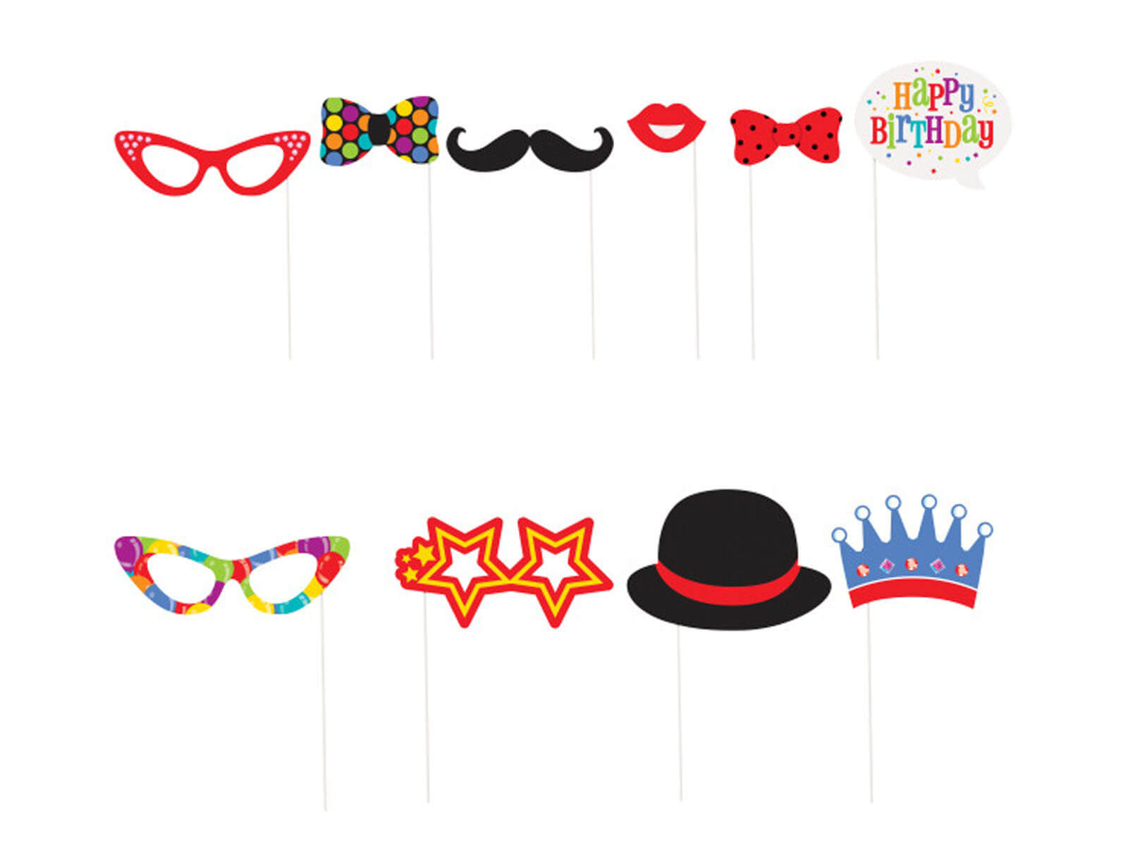 Fedezze fel a születésnapi fotó kellékeinket, botra szerelve. Ez a készlet 10 válogatott elemet tartalmaz, amelyek minden születésnapi partihoz bájt adnak.