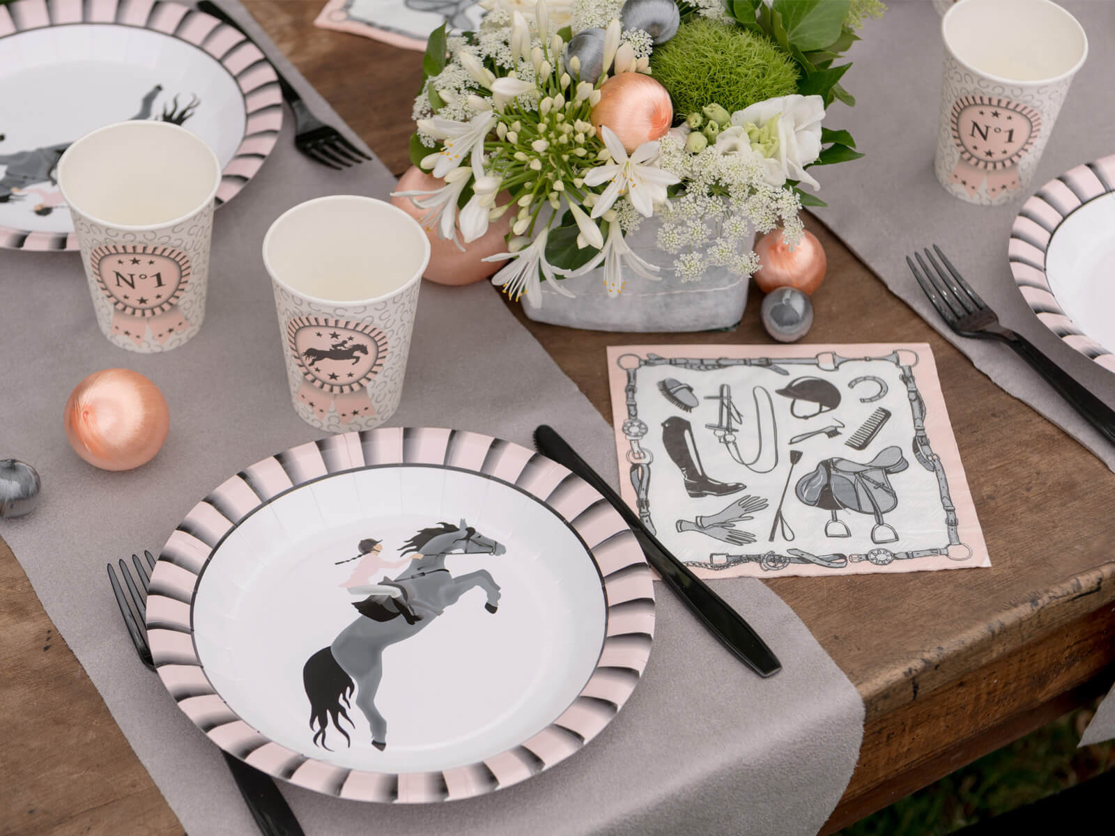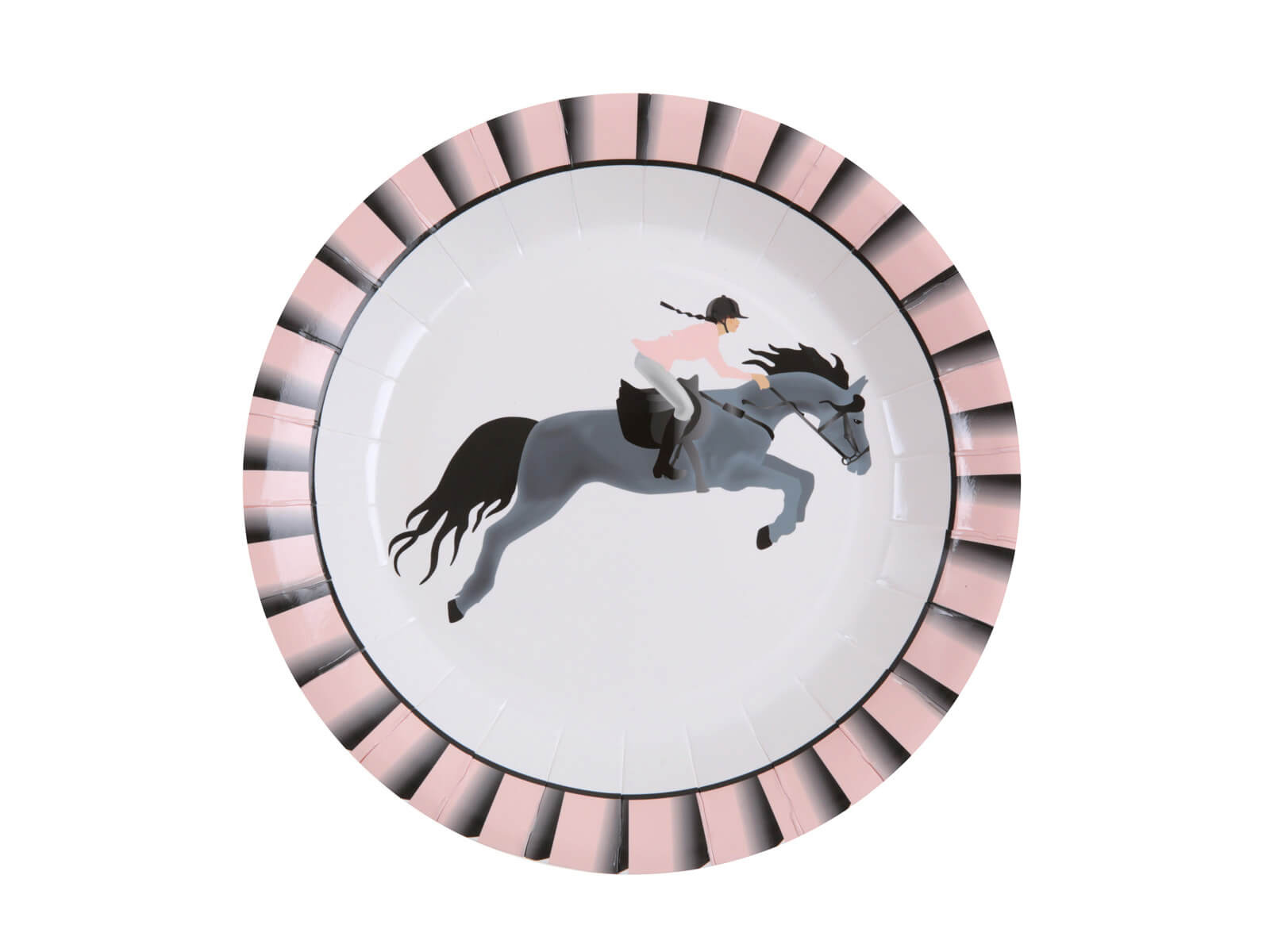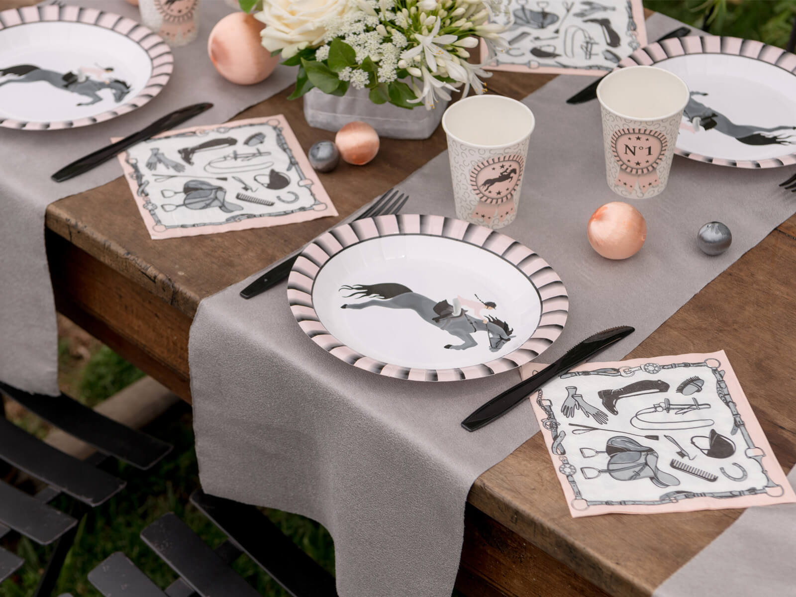 • Papírtányérok lovas lovassal nyomtatva, ideális a lovaglás szerelmeseinek születésnapjára.
