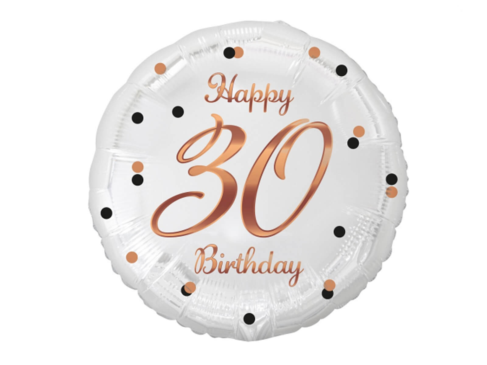 • Fehér fólia léggömb rózsaarany felirattal Happy 30th Birthday, tökéletes egy 30. születésnapi partihoz.