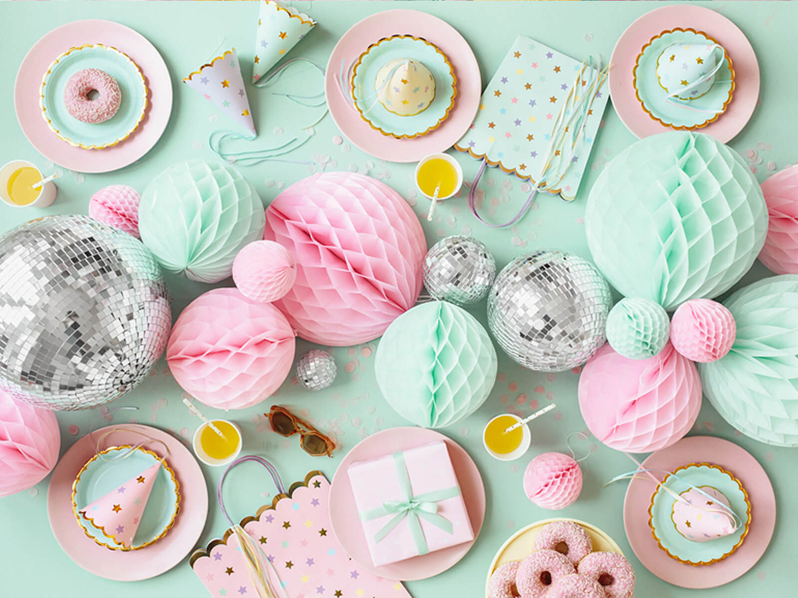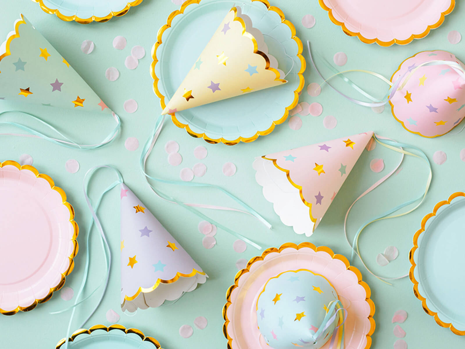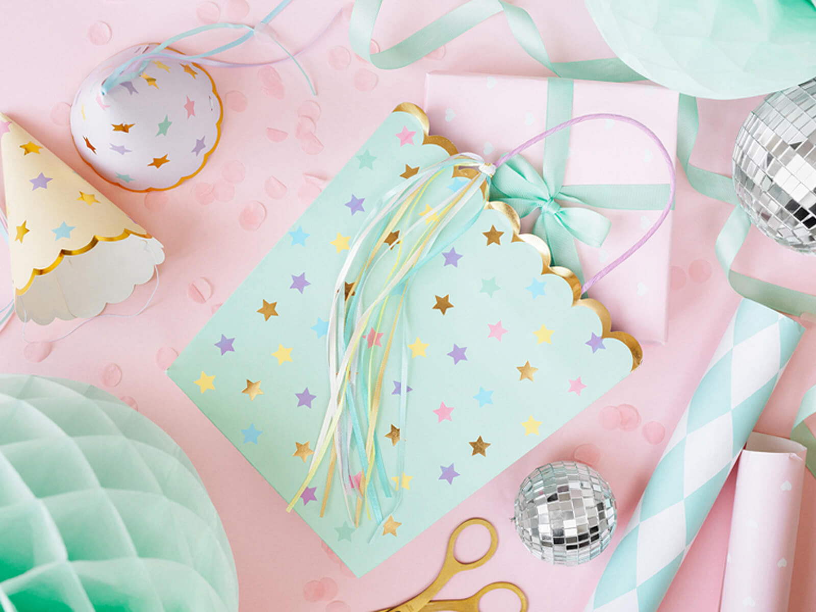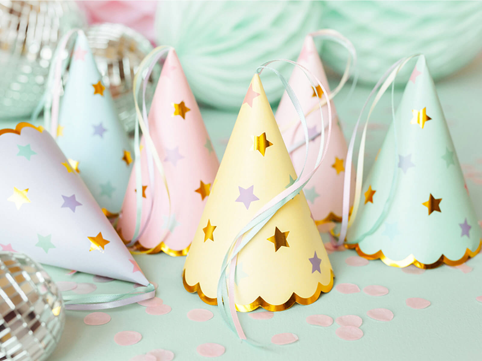• Papír sapkák pasztell színekben, csillagmintával, szatén szalaggal díszítve..
