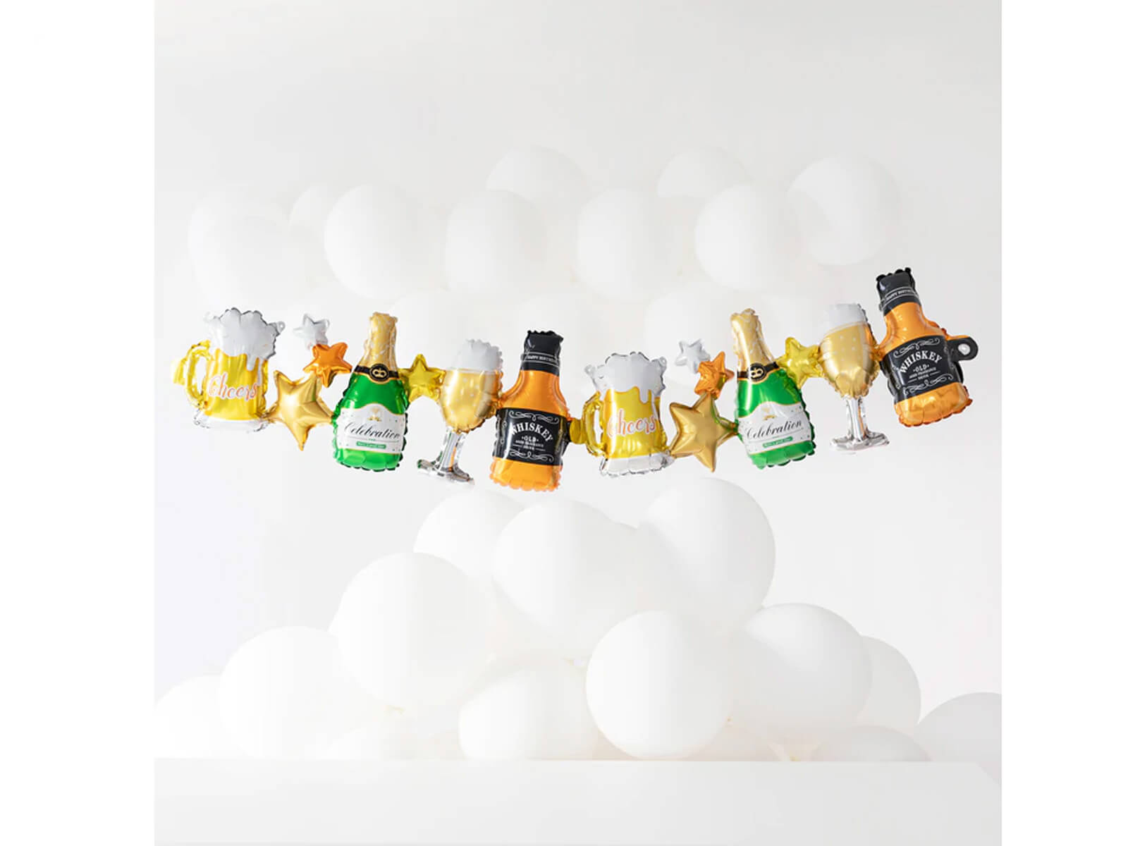 A születésnapi füzérünk léggömbökkel whiskey palack, pezsgőspohár, pezsgőspalack és söröskorsó alakjában nemcsak nagyszerű dekoráció, hanem nagyszerű ajándékötlet is. A méretek 34 cm x 206 cm-esek, ami a füzért rendkívül látványossá és feltűnővé teszi. Képzelje el a vendégek arcán a csodálkozást és az örömöt, amikor ilyen szokatlan dekorációt látnak!