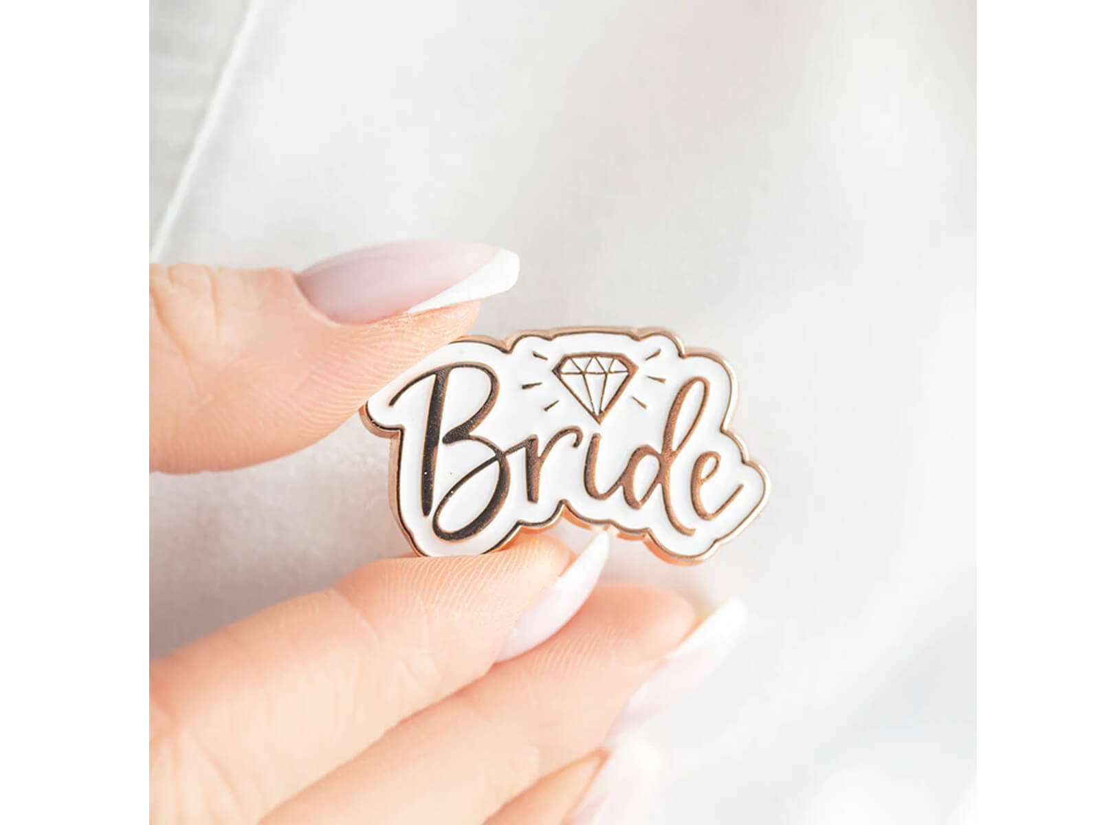 • Zománc bross rózsaarany Bride felirattal, tökéletes egy menyasszonyi estéhez.