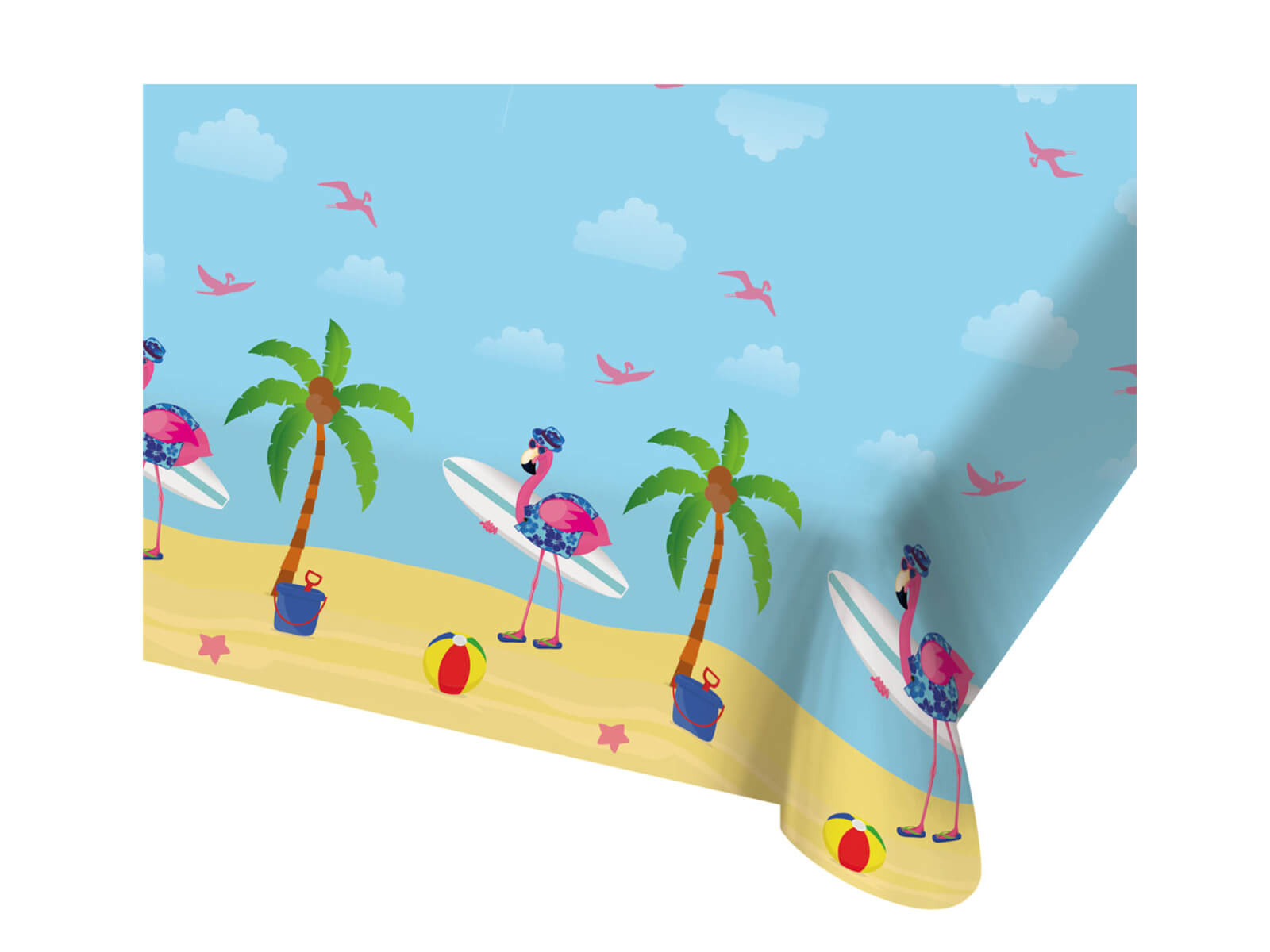 • Fólia terítő rózsaszín flamingókkal, tökéletes egy hawaii partihoz.