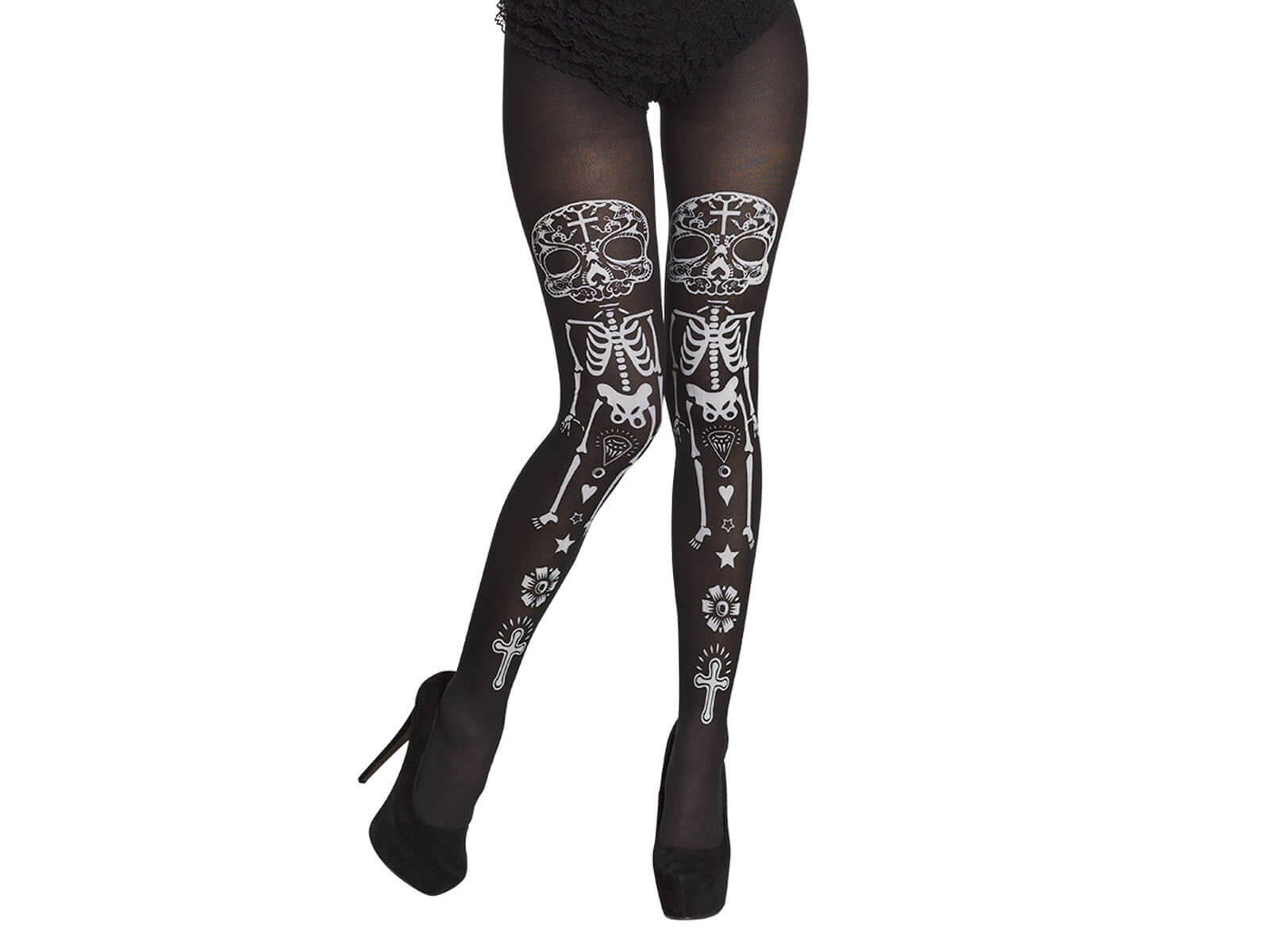 Üdvözöljük a Dia de los Muertos, mexikói halottak fesztiválja, hála a 'Mexikói koponya' harisnyanadrágunknak. Tökéletes felnőttek számára, ez az egyedi harisnyanadrág feltűnő csontvázmintával fűszerezi bármelyik halloweeni jelmezt. Sokoldalú méretben és tartós 40 denier anyagból készült, kényelmet és tartósságot kínálnak.