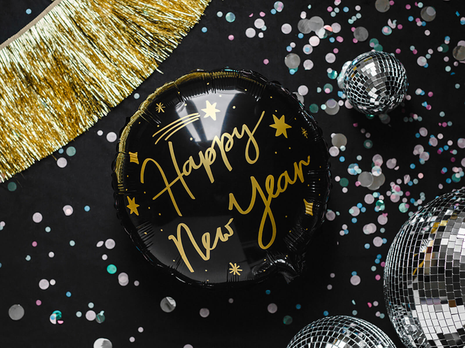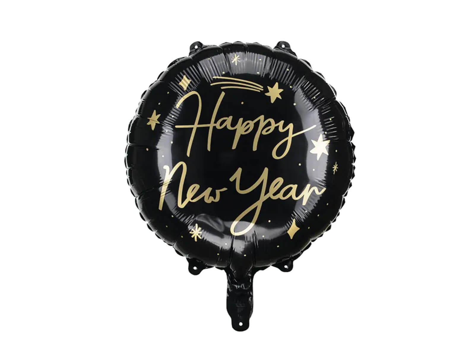 • Kerek fólia lufi fekete színben, arany felirattal Boldog új évet - szilveszterre, újévre, újév napjára.